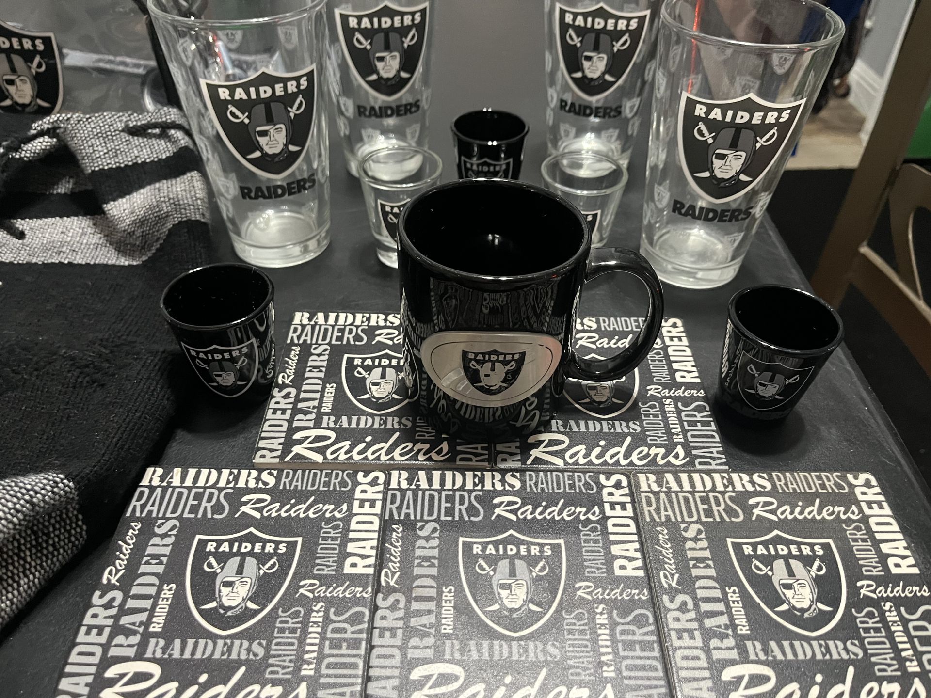 He drawn really, really good condition Raiders gear backpack handbag, coasters shot glasses traditional, drinking glasses, coffee mug take everything for 50 bucks