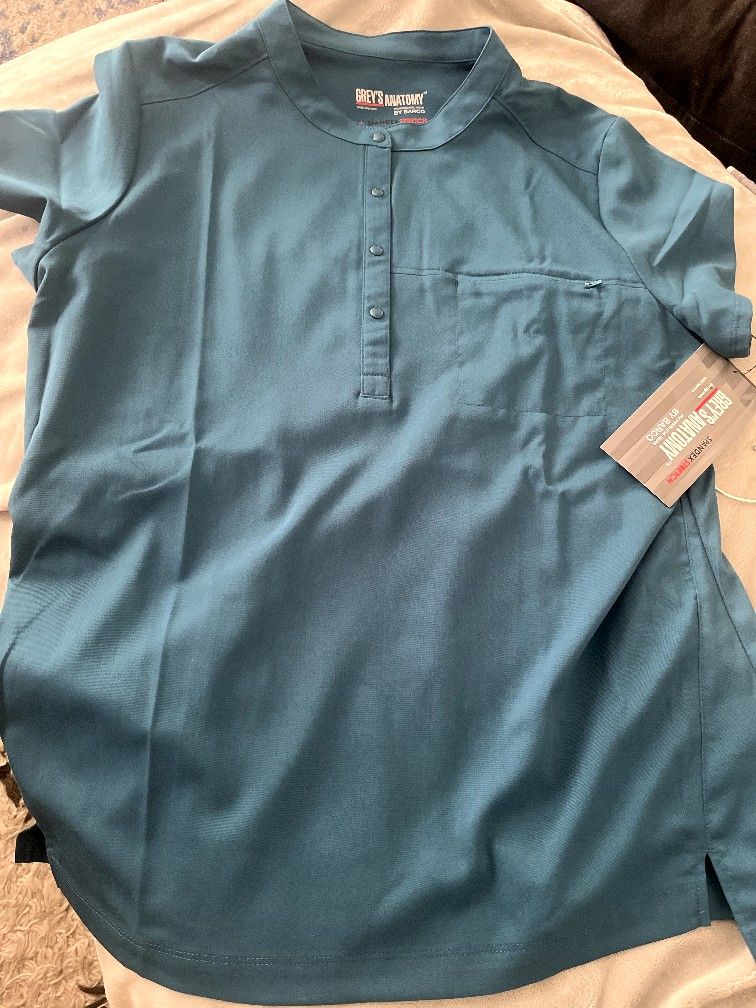Turquoise Grey's Anatomy by Barco Rush Scrub Top for Women .. Size Large .. Banded collar with snap buttons · Hidden zipper chest pocket · Straight high-low hem · Spandex-stretch moisture-wicking fabric · Resists soil, static ... New Never Been Worn .. Make Offer .. Pickup Preferred