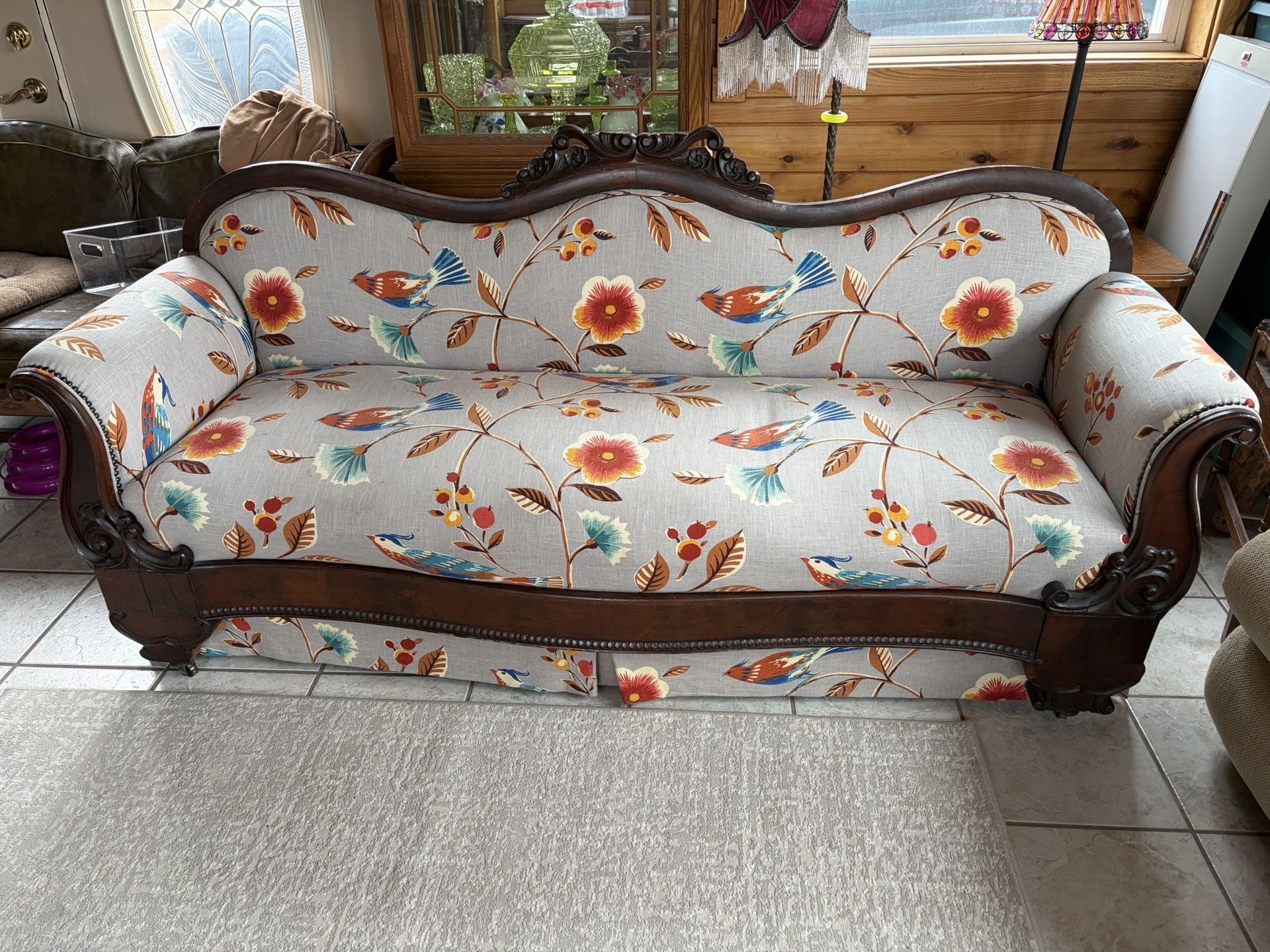 Antique 1880s Victorian Sofa 6'6" length, 3' height, 25" width Newly reupholstered Original hand-carved solid-wood details On wheels Good condition Pick-up only $250