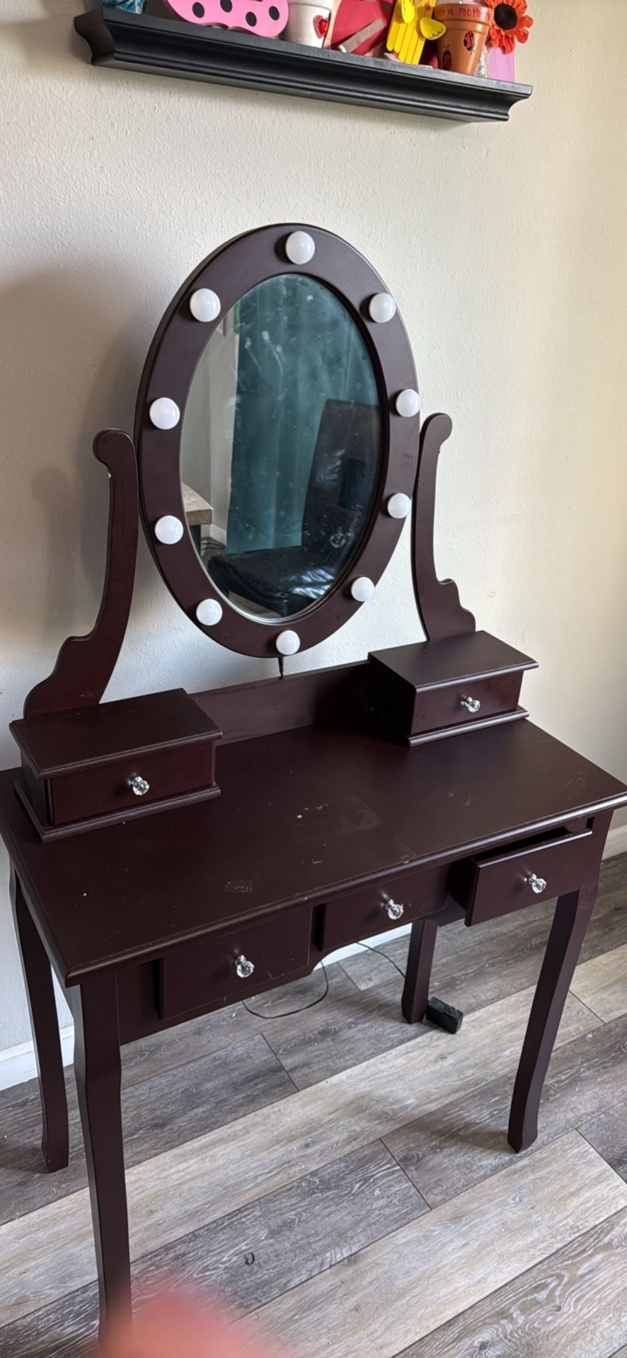 Brown girls vanity. Used. Lights work. Mirror sits on top unattached. the desk alone is 28” H x 31” L x 15.5” Depth. With the mirror from top of mirror down is 54”H