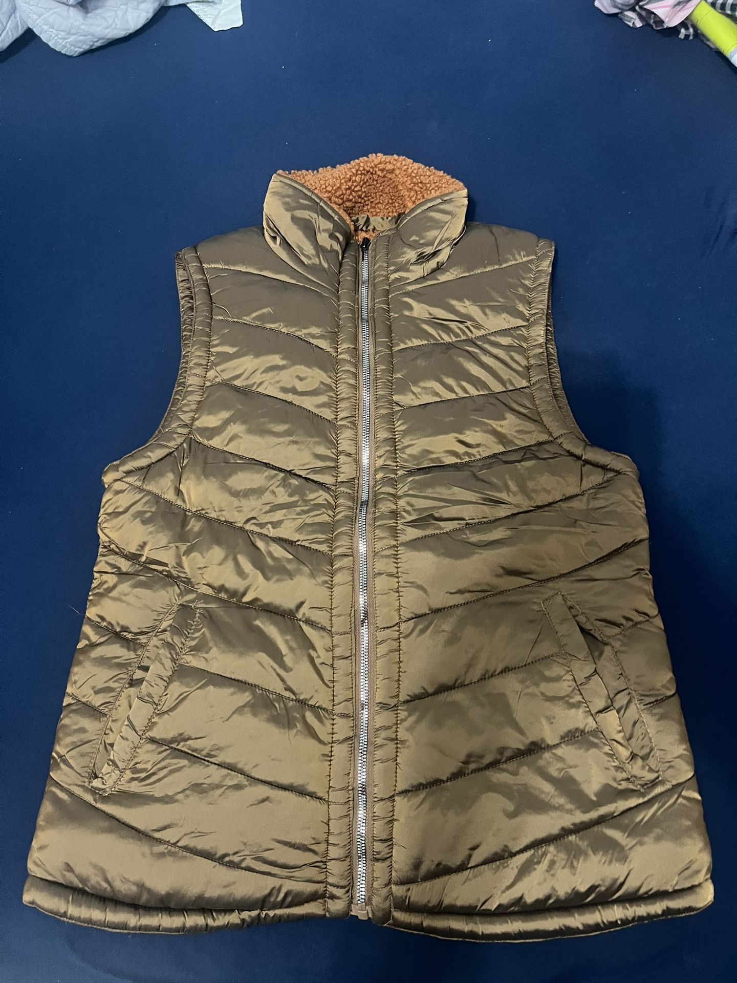 I'm selling a hooded puffer vest in a brown color. It's reversible with a sherpa lining on the other side. Great for layering! Size M (fitted) ‼️BROWSE MY PAGE for more items🚨🚨