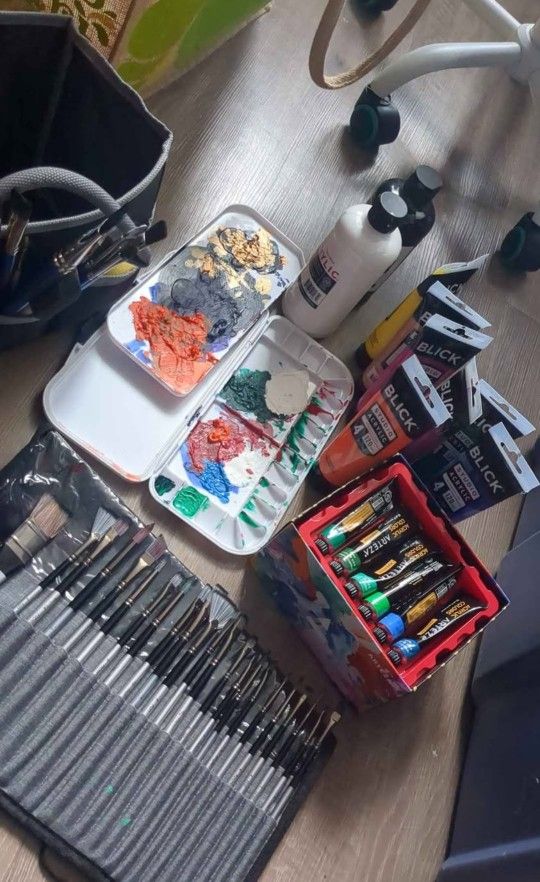 Brushes, paint, metal easel, paint pallet, paint bag all in good shape 3 16x20 canvases Moving need to get rid asap!