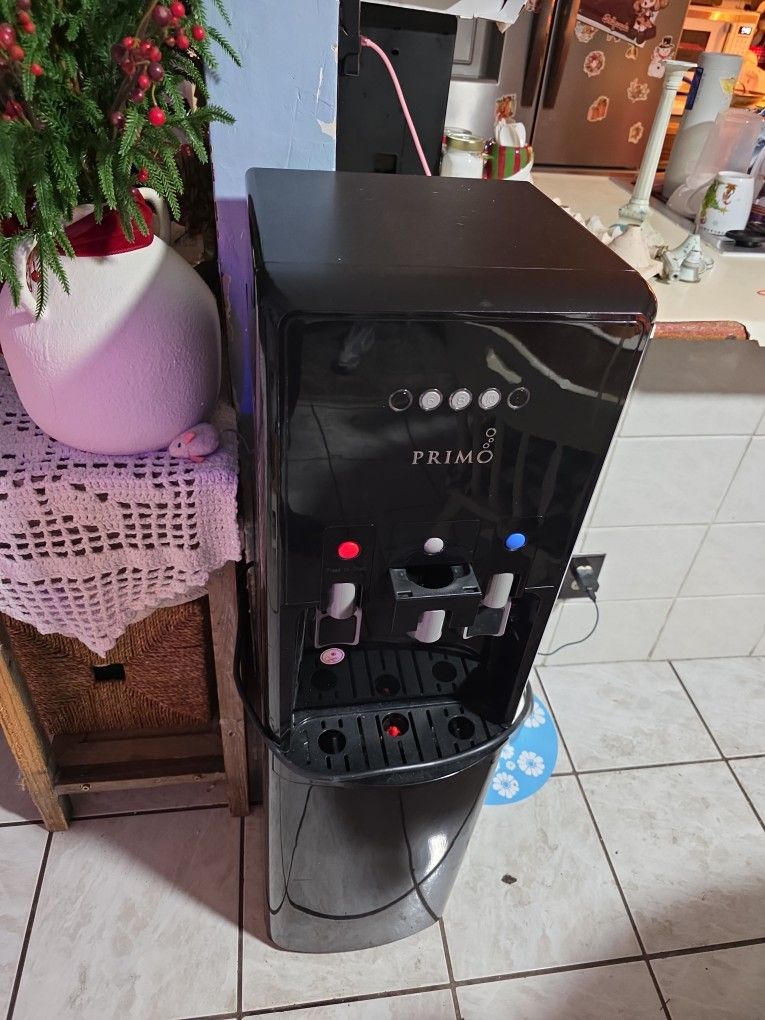 Water Dispenser Does Not Dispense Cold Water but does Dispense Hot Water as Well As You being able to Put Coffee Pods Into The Middle Gray Slot To Make Instant Hot Coffee!