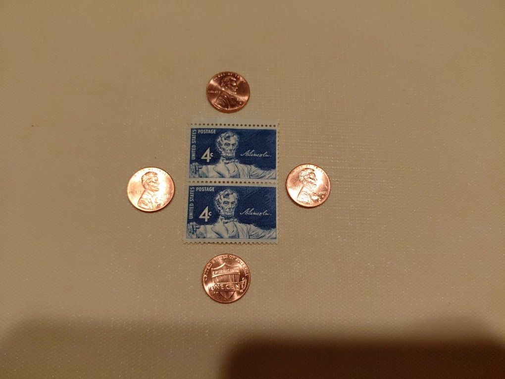 2,,VERY NICE ABRAHAM LINCOLN 4 CENT STAMPS TOGETHER,,NEVER USED,,WITH 4, BEAUTIFUL 2025 D,,PENNIES, NOT MAKING ANY MORE FOR NOW, TAKE EVERYTHING 5 DOLLARS,,LOCAL PICK UP ONLY RIVERSIDE CA LA SIERRA AND INDIANA