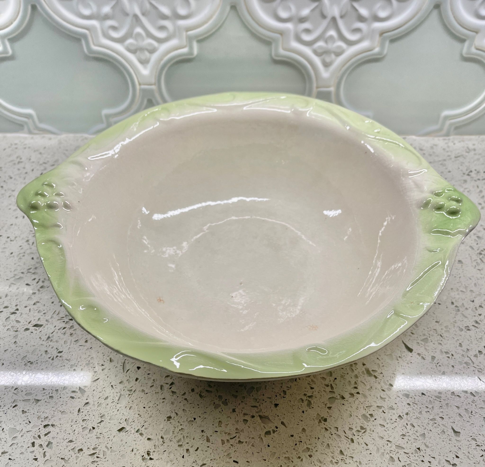 Vintage circa 1950’s large Mid Century Modern 2 Handled White & green Bowl with Grape Clusters from California Pottery. Makes a beautiful Center Piece, fruit bowl or Serving Bowl. #444 made in USA. Excellent vintage condition, no chips or cracks (examine all photos). This bowl measures 11 1/2" diameter 3 1/2" high.