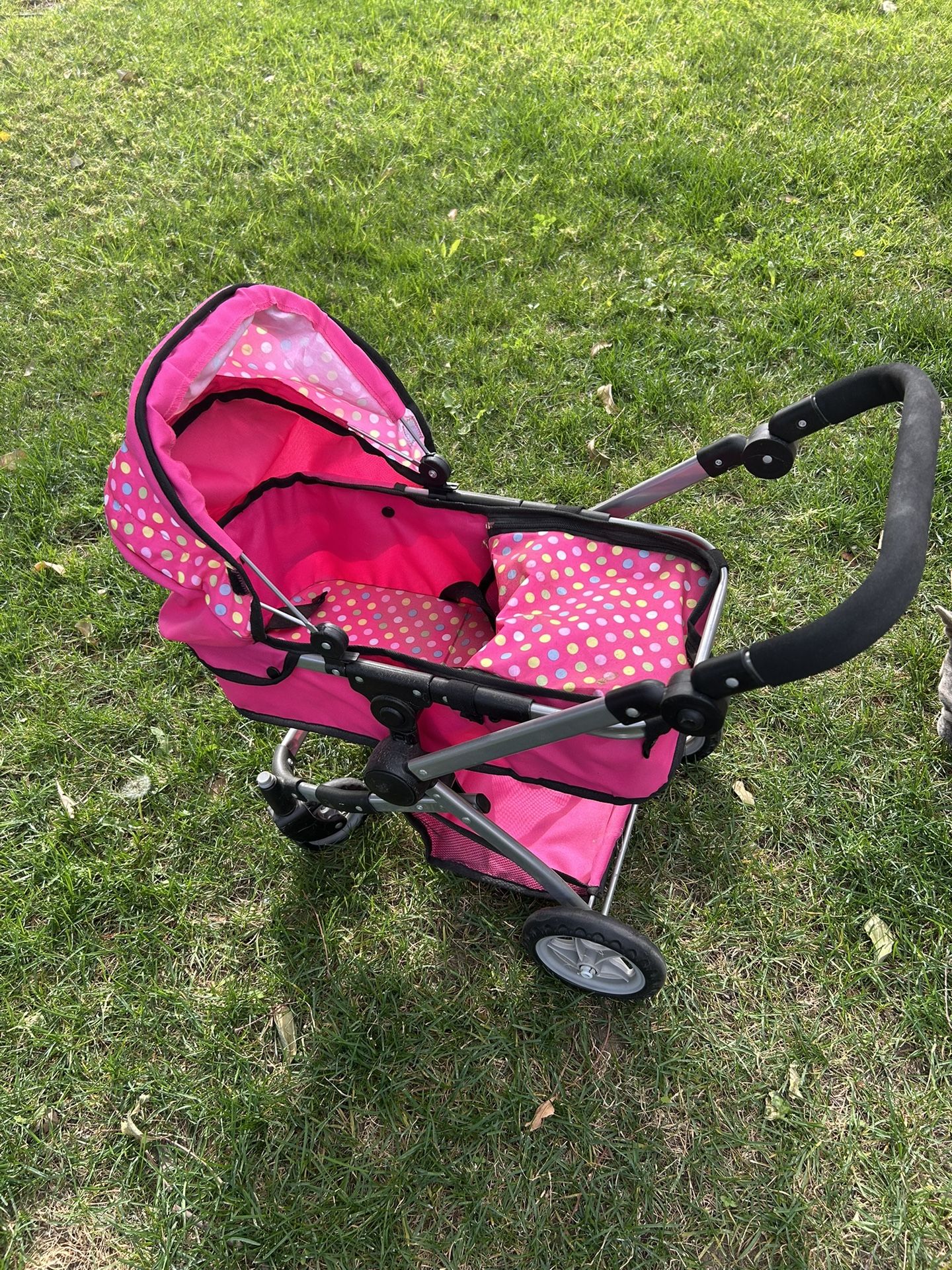 My daughter is 7 and still loves this cute thing for her dolls! Up to 2 fit depending on the size of the doll. It’s in great condition. Just needs a little dusting off.