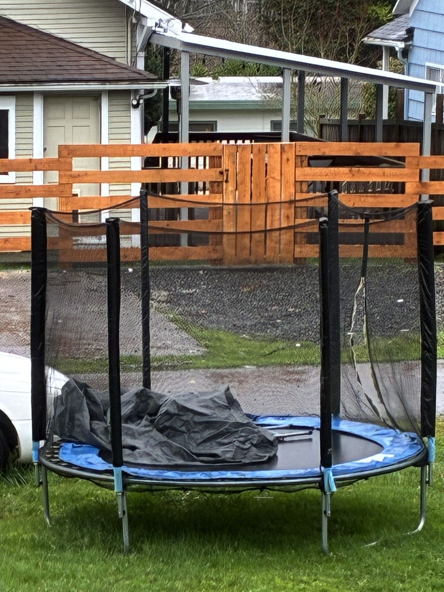Great condition / lightly used. No holes in netting or trampoline floor. All hardware good. No poles are bent.