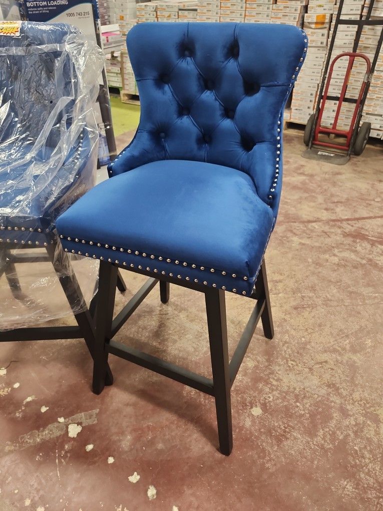 Boyel Living 38.4 in. H Blue Swivel Velvet Wood Bar Stool with Button Tufted Decoration and Wooden Legs, Set of 2