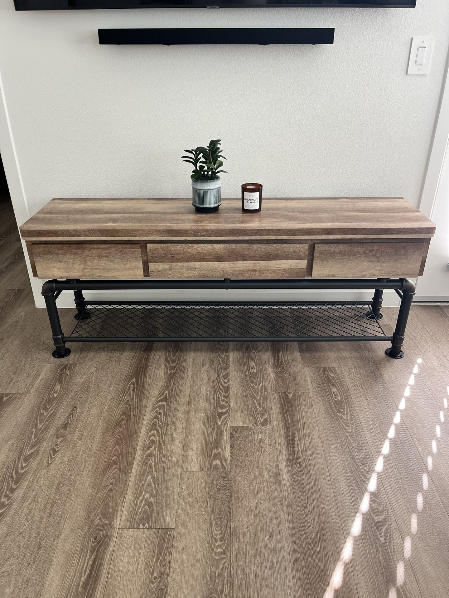 High-quality Furniture of America industrial TV stand with a rustic wood finish and black metal pipe-style frame. Modern industrial look and is built solid — much heavier and sturdier than typical flat-pack furniture. Features: Genuine Furniture of America brand Industrial wood finish (rustic oak / natural tone) Heavy-duty black metal pipe frame Wire mesh lower shelf for storage or decor Smooth drawer fronts with concealed storage Fully assembled Fits large TVs Measurements: 60”L x 15.5”W x 23”H Retail is $600+ unassembled Serious inquiries only please. No trades. Pickup near 51/Cactus Rd.