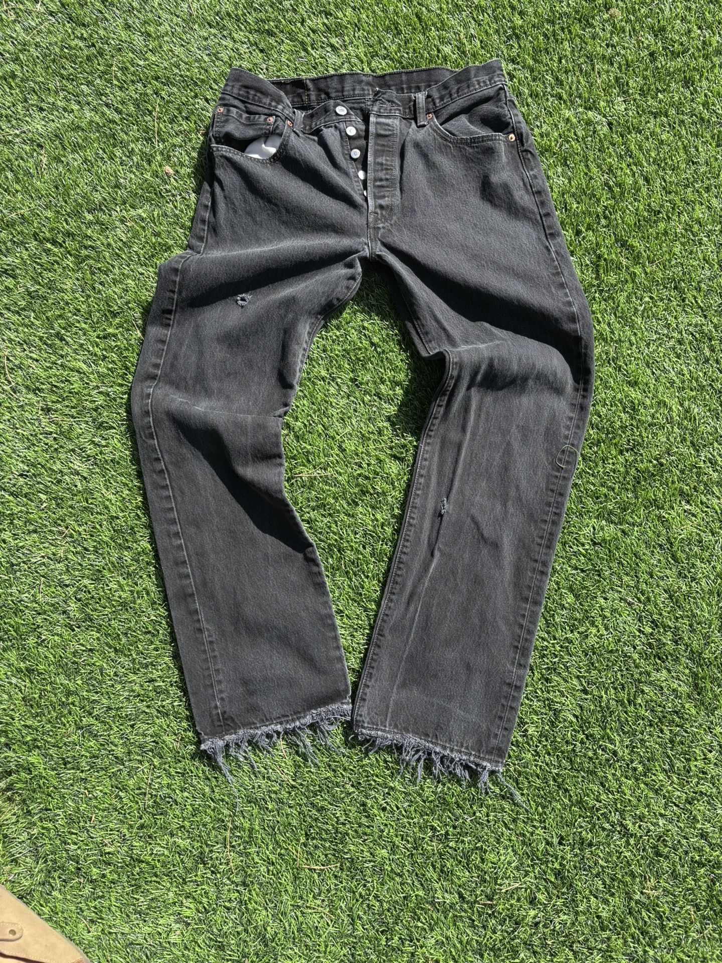 Classic 501 fit with a straight leg and that original Levi’s feel. The bottoms are distressed, giving them a worn-in look without overdoing it. Black denim goes with pretty much anything — easy to dress up or keep casual. Size 34 waist, 34 length. Solid everyday pair if you like that timeless Levi’s style with a little edge.