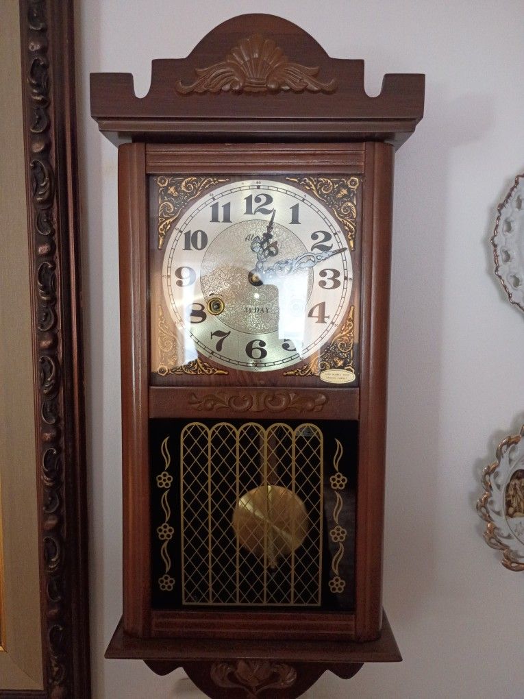 Gorgeous like new windup Wall clock. Works perfectly. The half hour and on the hour indicators work perfectly. Of course it has the key. Operates like new. Beautiful peace for any office, apartment, college dorm, or home. Don't miss out on this one. It's priced to move.