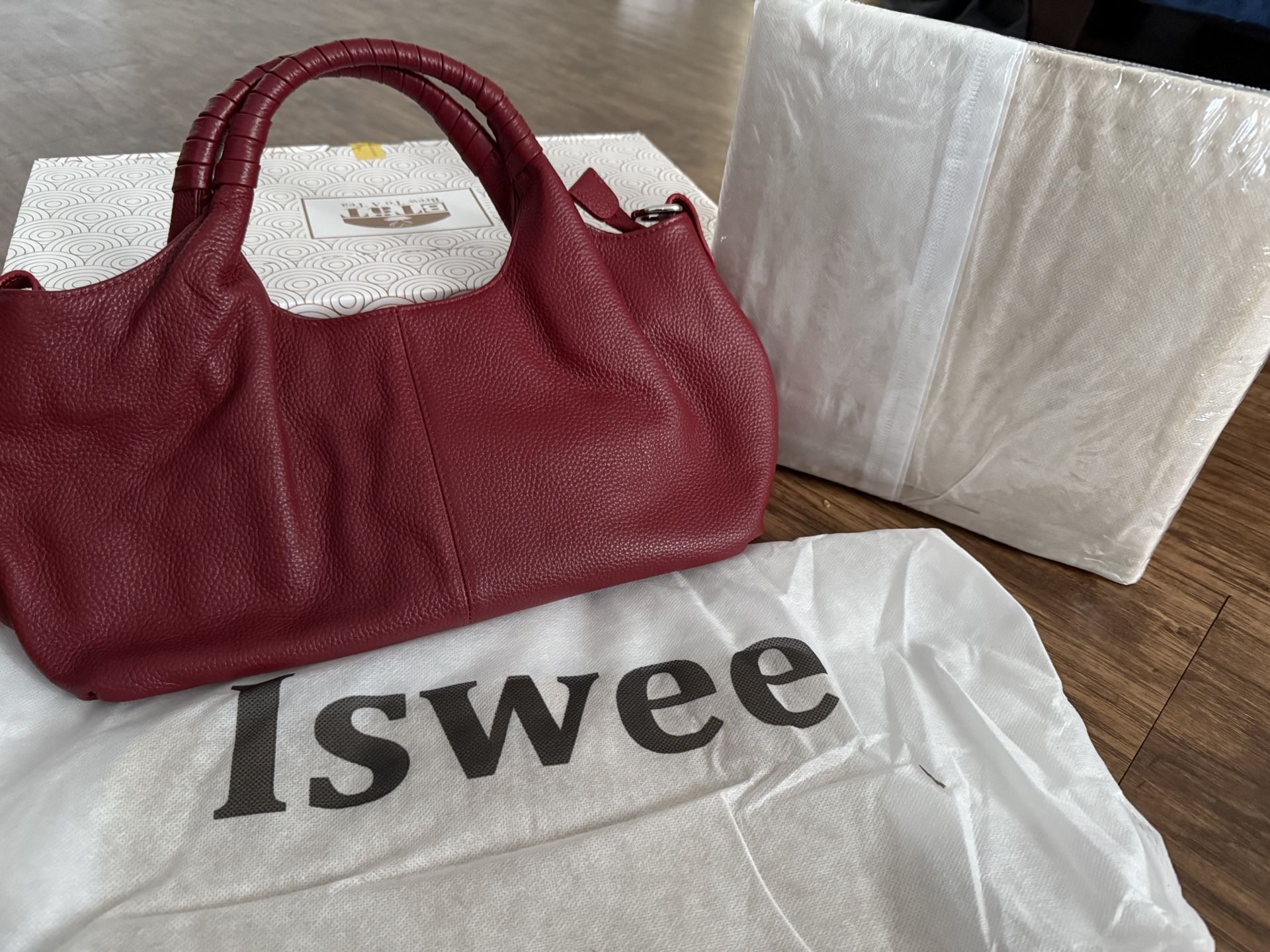 Iswee 100% genuine leather hand bag with original packaging and complimentary purse organizer. $80. Store value $95.