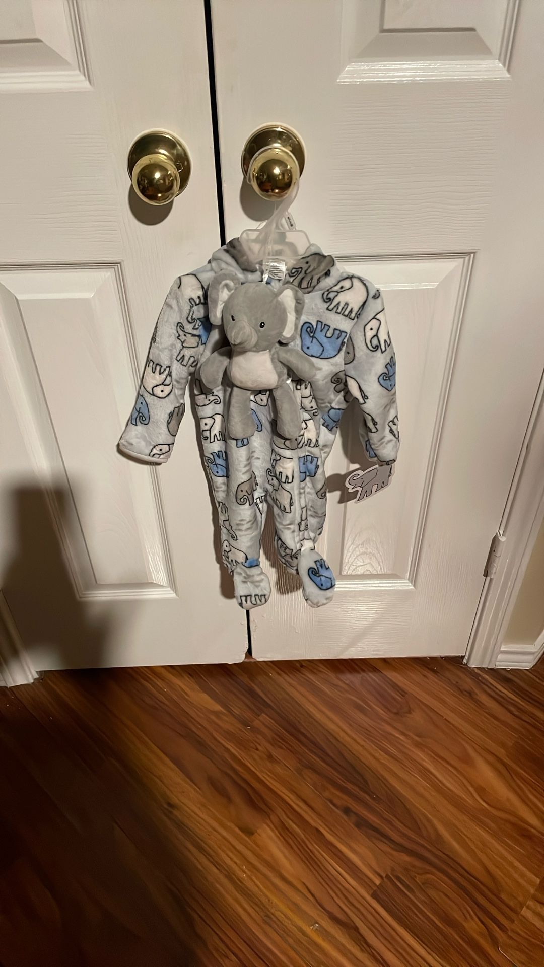 Cute onsie for 3 months old baby boy with elephants, hoodie and with toy. Very warm. Pick up in mesquite and cash only please