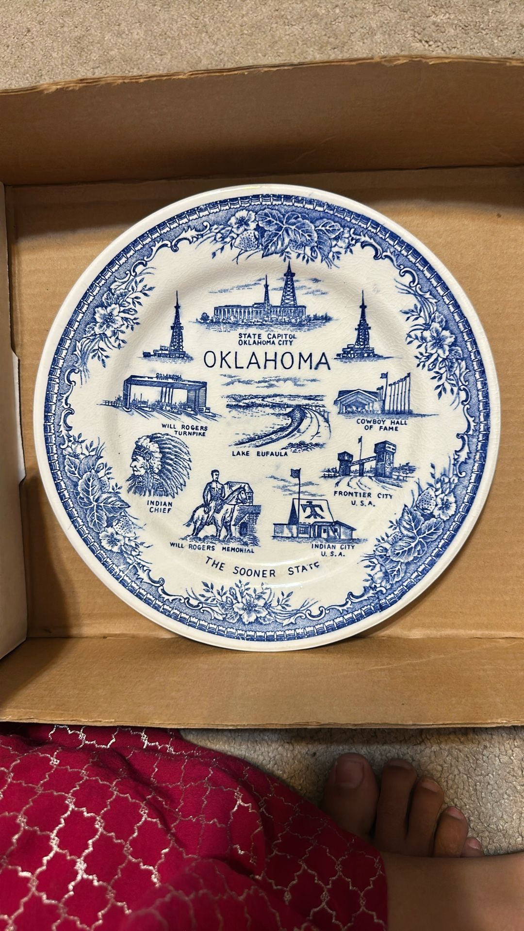 The image shows a vintage Oklahoma souvenir plate, likely from the mid-20th century, featuring various landmarks and symbols of the "Sooner State" in a blue and white transferware design. Key Features and Information: Imagery: The plate depicts notable Oklahoma attractions and figures, including the Will Rogers Memorial, Cowboy Hall of Fame, Lake Eufaula, the State Capitol in Oklahoma City, Frontier City, and an "Indian Chief" figure. Will Rogers himself is prominently featured. Material and Origin: These plates were often made of porcelain or fine American ironstone, and many were produced by companies like Enco National. Collectible Value: Such vintage souvenir plates are considered collector's items, particularly for those interested in state memorabilia or Americana.