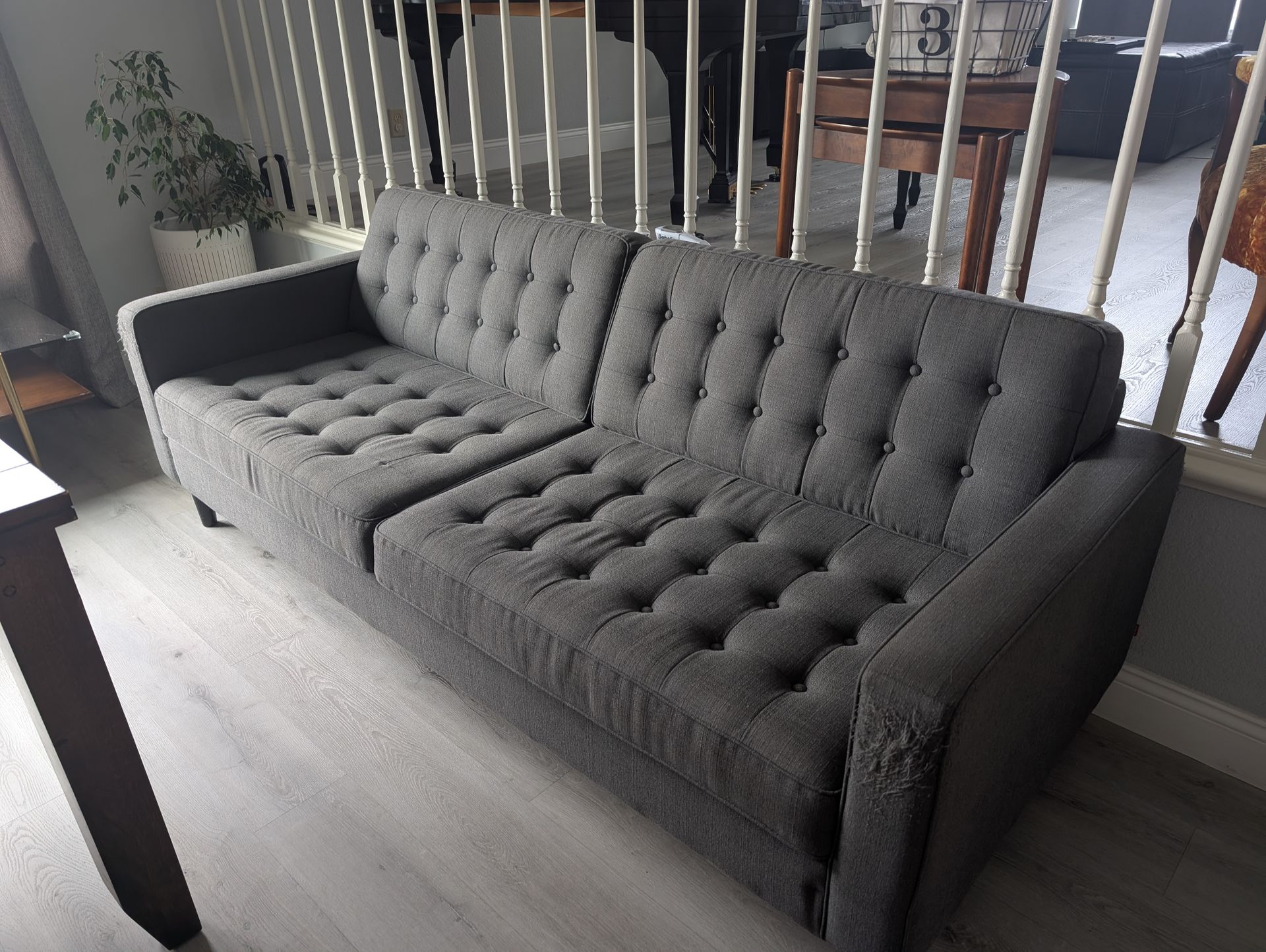 Construction and cushions are great, barely used. But the arms have scratches from my cat. It is a great deal if you don't care about them or know and want to patch the scratches.