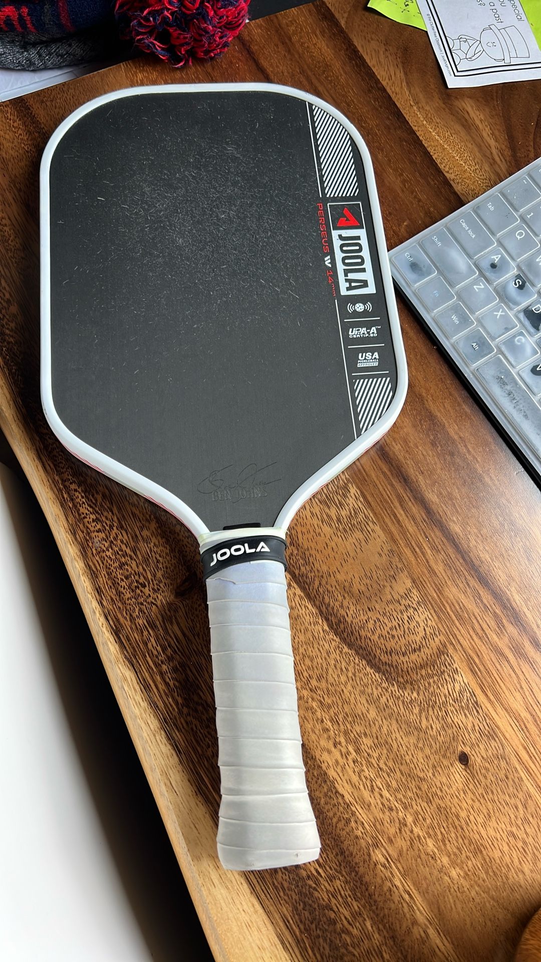 * Selling a Joola Perseus Pro IV 14 mm paddle, currently weighted at 8.3 oz with lead tape for added stability and plow-through. * Condition: Very good. Lightly scratched faces, tight edgeguard, no cracks or dead spots. * This is a top tier paddle known for its hard hitting power, ideal for intermediate to advanced players looking for a solid feel. * Lead tape can be removed or adjusted based on your play style.