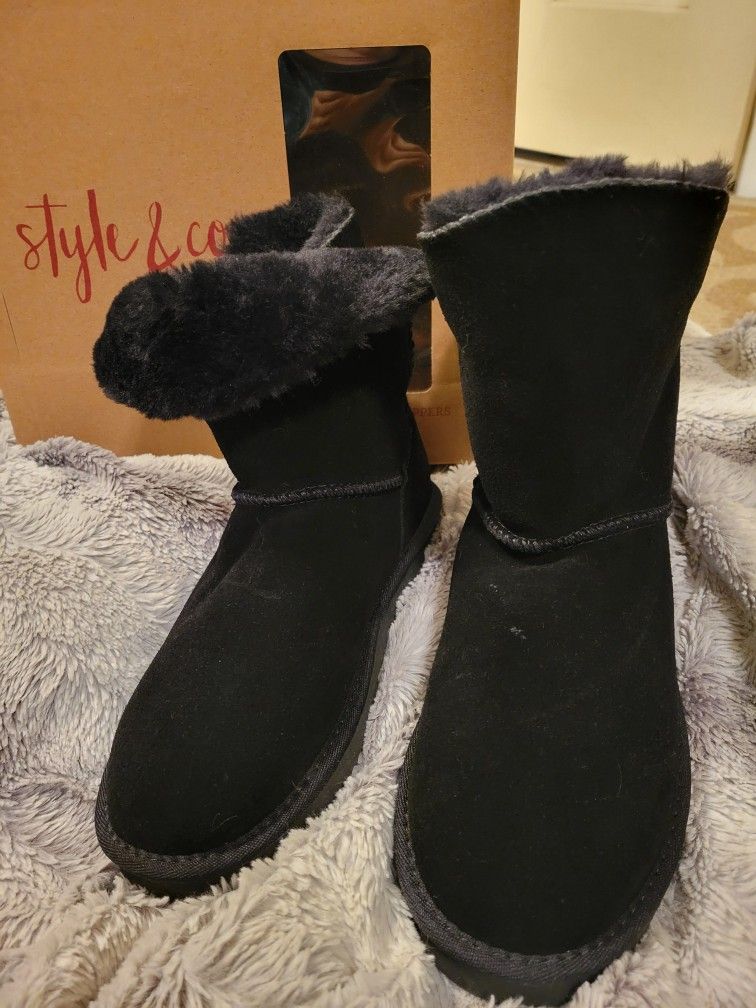 Macys Style & Co. Black Suede Boot New never wore. Fur- lined, Strap in back for looks. H 9.5" and Real Leather.