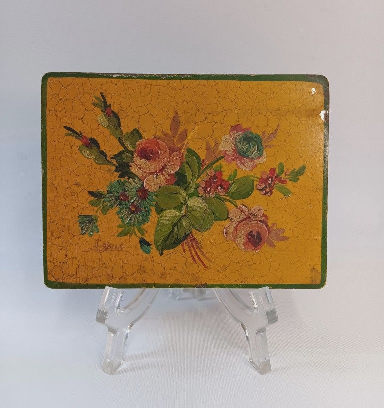This vintage metal hinged trinket box with handpainted flowers and artist signature is a beautiful addition to any collector's display. The multicolor floral pattern on the rectangular shape gives it a unique charm. The box is made of metal with a metallic finish and comes boxed. It is an original piece, but the country or region of manufacture is unknown. Perfect for storing jewelry or other small trinkets, this collectible is a must-have for any lover of vintage decor.