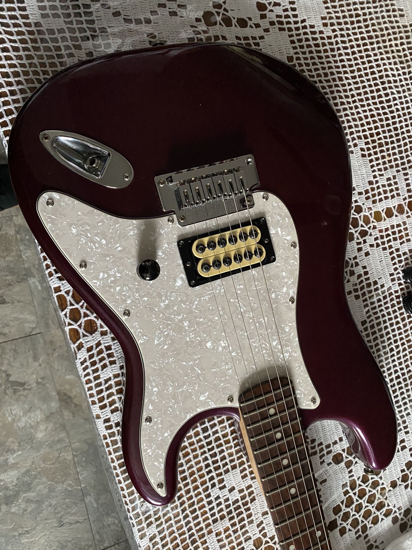 FSOT Squier Stratocaster Tom Delonge inspired the back has been filled with woodblock and has a hardtail bridge plus has original from a real squier tom Duncan Detonator. It does have 4 dings on back of frets 2&3 but the neck is from early 2000s so real rosewood Looking to sell or trade just let me know what yall have!
