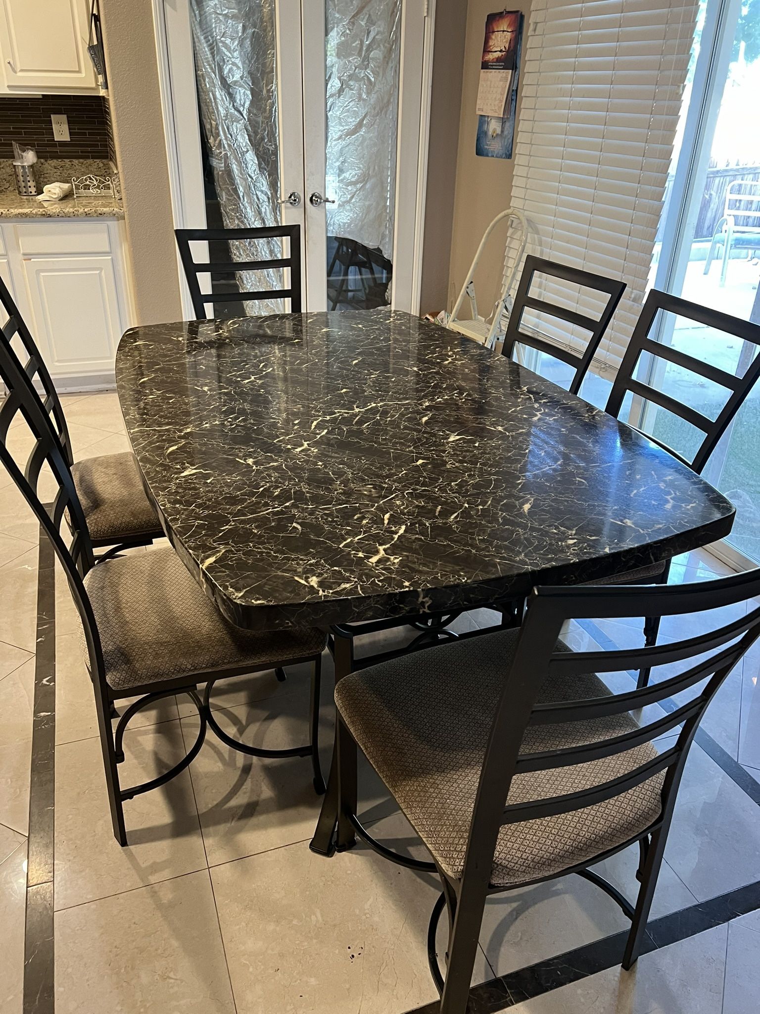 Heavy duty granite table with metal base including 6 metal chairs that need to be cleaned or you can replace the cushions