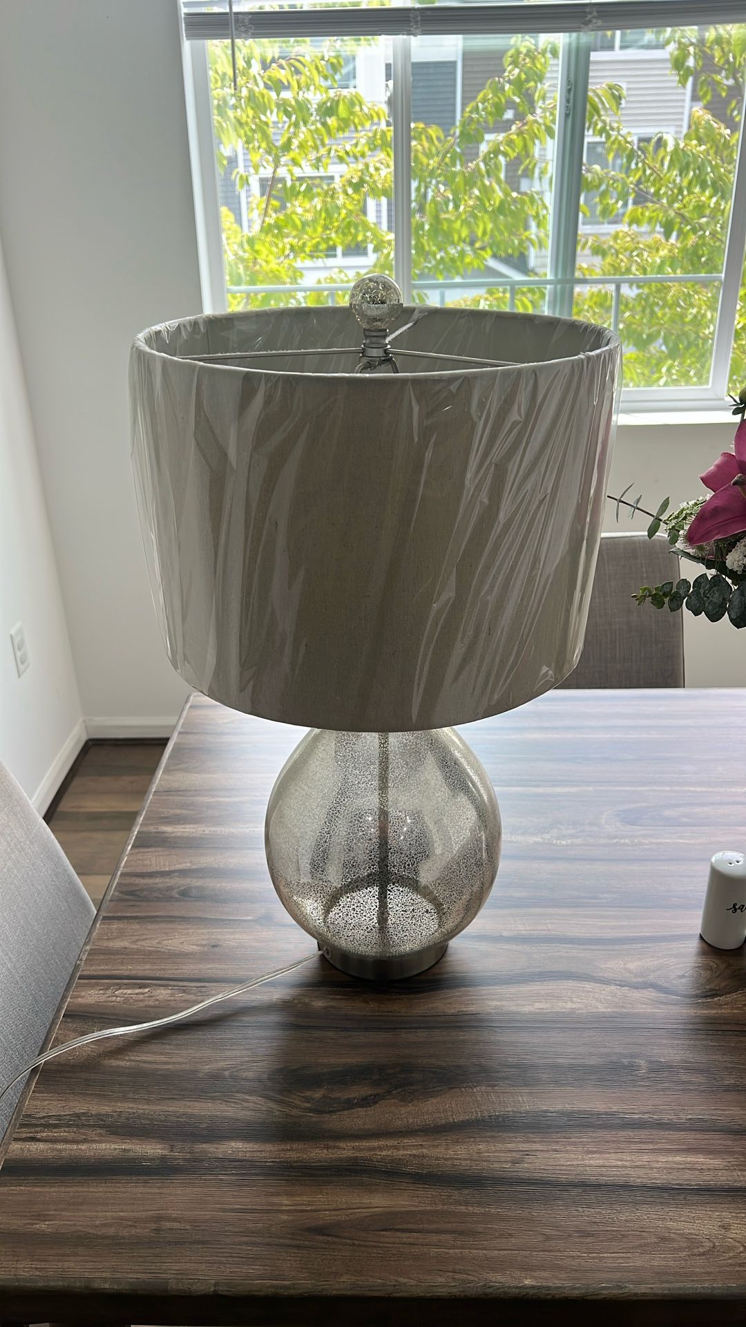 Tear drop silver lamp from Pier 1 Plastic cover still on lamp shade