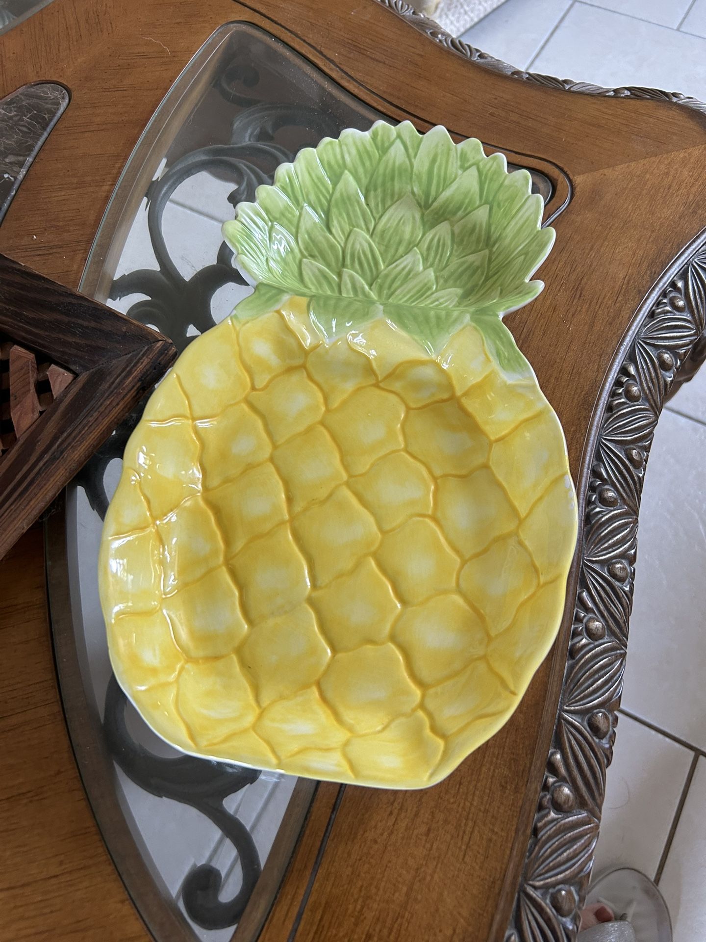 This Vintage Magenta Pottery Pineapple Serving Platter is a stunning ceramic dish with a glossy finish, featuring a unique pineapple shape. Measures 14" x 8" x 1.25". Both functional and decorative, adding a touch of vintage charm to your table setting. The original pineapple-themed design is perfect for serving dishes or displaying as a decorative piece in your home. Multi-purpose, it can be used for sauces, side dishes, snacks, etc. This piece is dishwasher safe for easy maintenance. Good Condition, No Chips or Cracks Pickup Details: * Located in East Orlando near UCF (32817) * No holds, first come, first served * Sold "As Is" with no exchanges, cancellations, or refunds Please note that the post will be removed once the item is sold. Check out my profile for other listed items!
