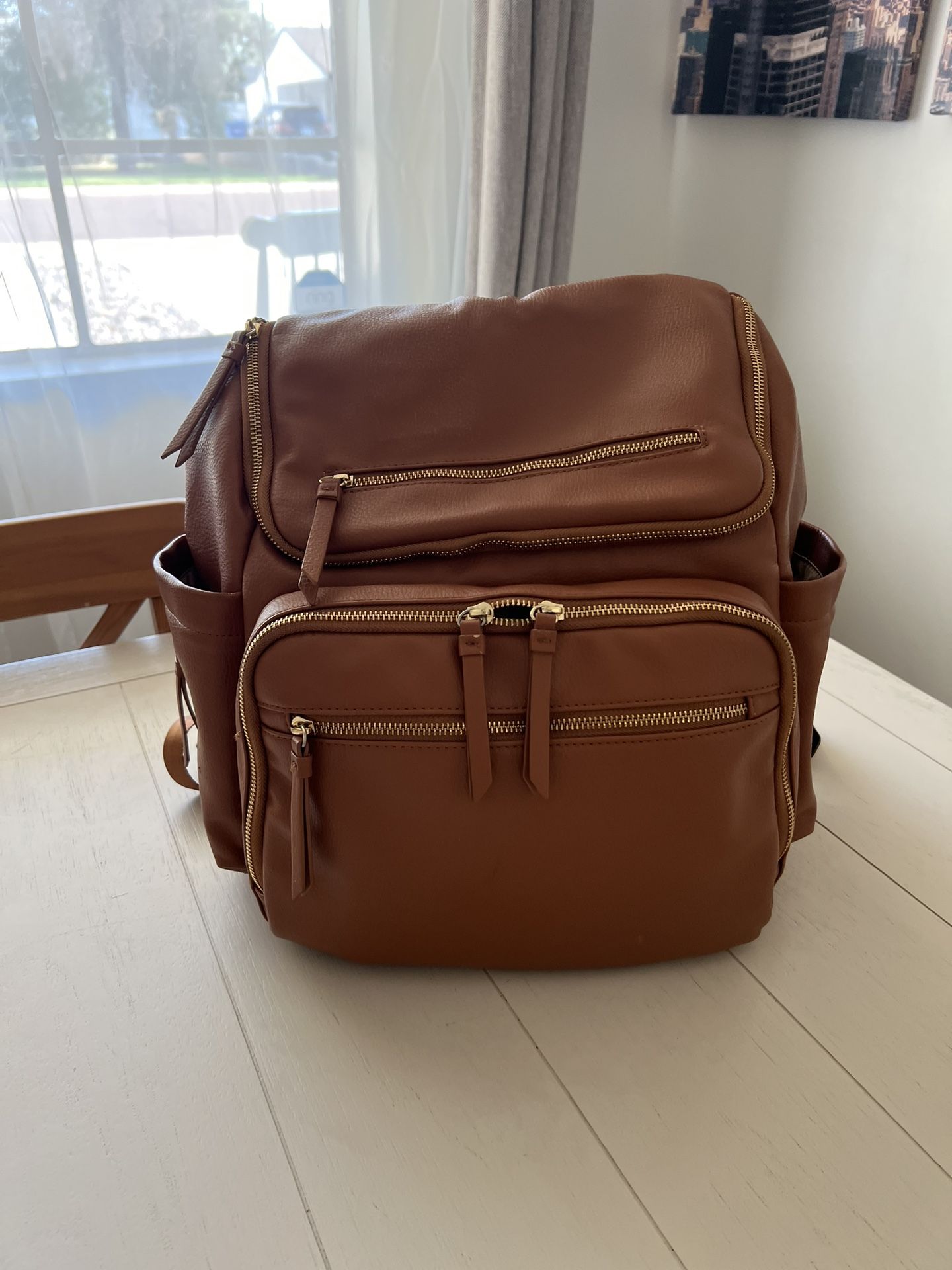 Almost new diaper bag. No scratches or dirty. It includes the changing mat. It has lots of pockets and bottle holders. It is a leather texture with gold zippers that are very smooth and strong. Lots of room for anything you may need