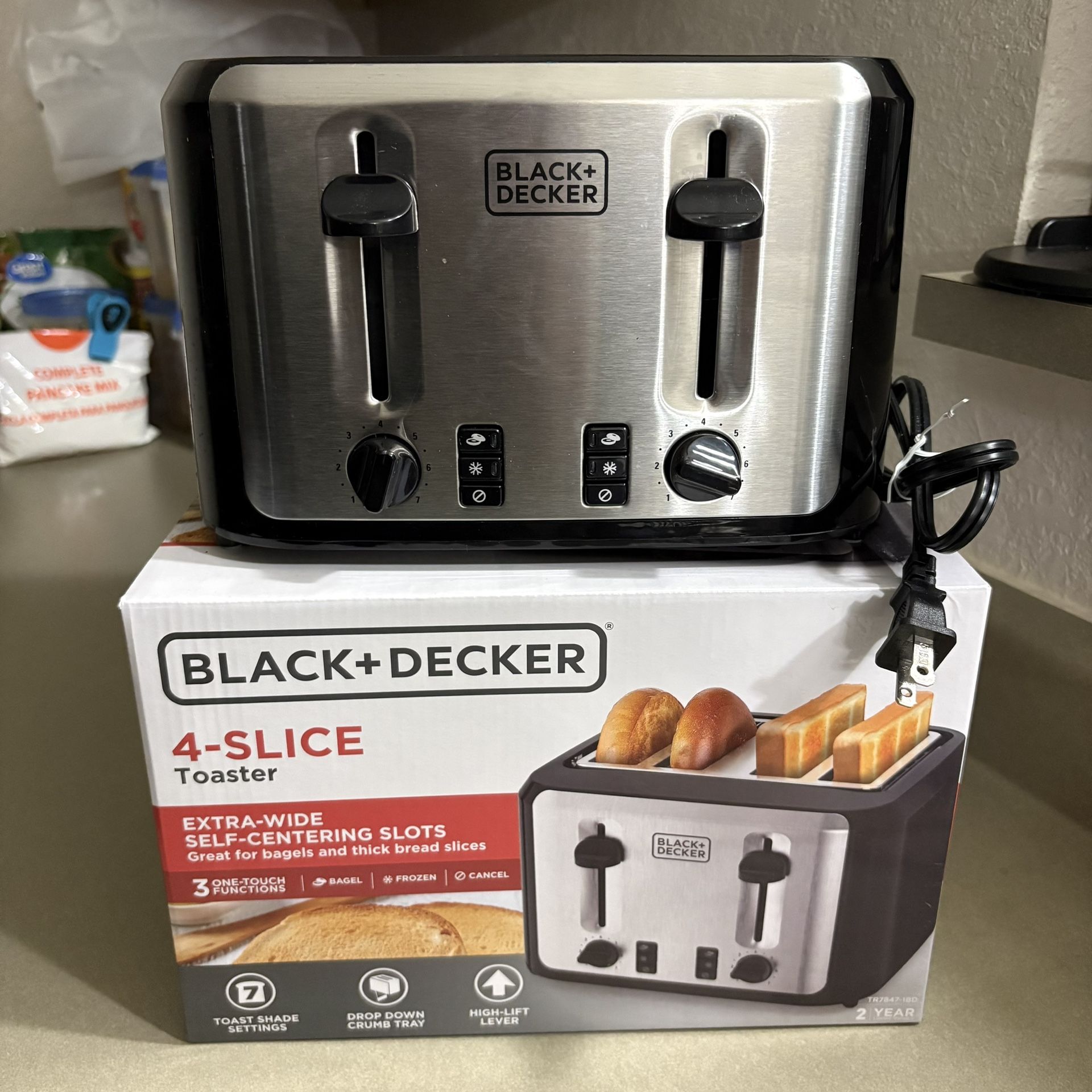 Black+ Decker 4-Slice toaster Has extra-wide and self-centering slots. Open box, good as brand new, no issues.