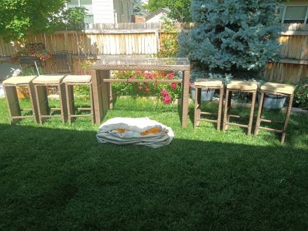 Outdoor Patio Furniture Wicker Set w Table 57" X 32" X 40" Tall Glass Top 6 Chairs w Cushions and Cover