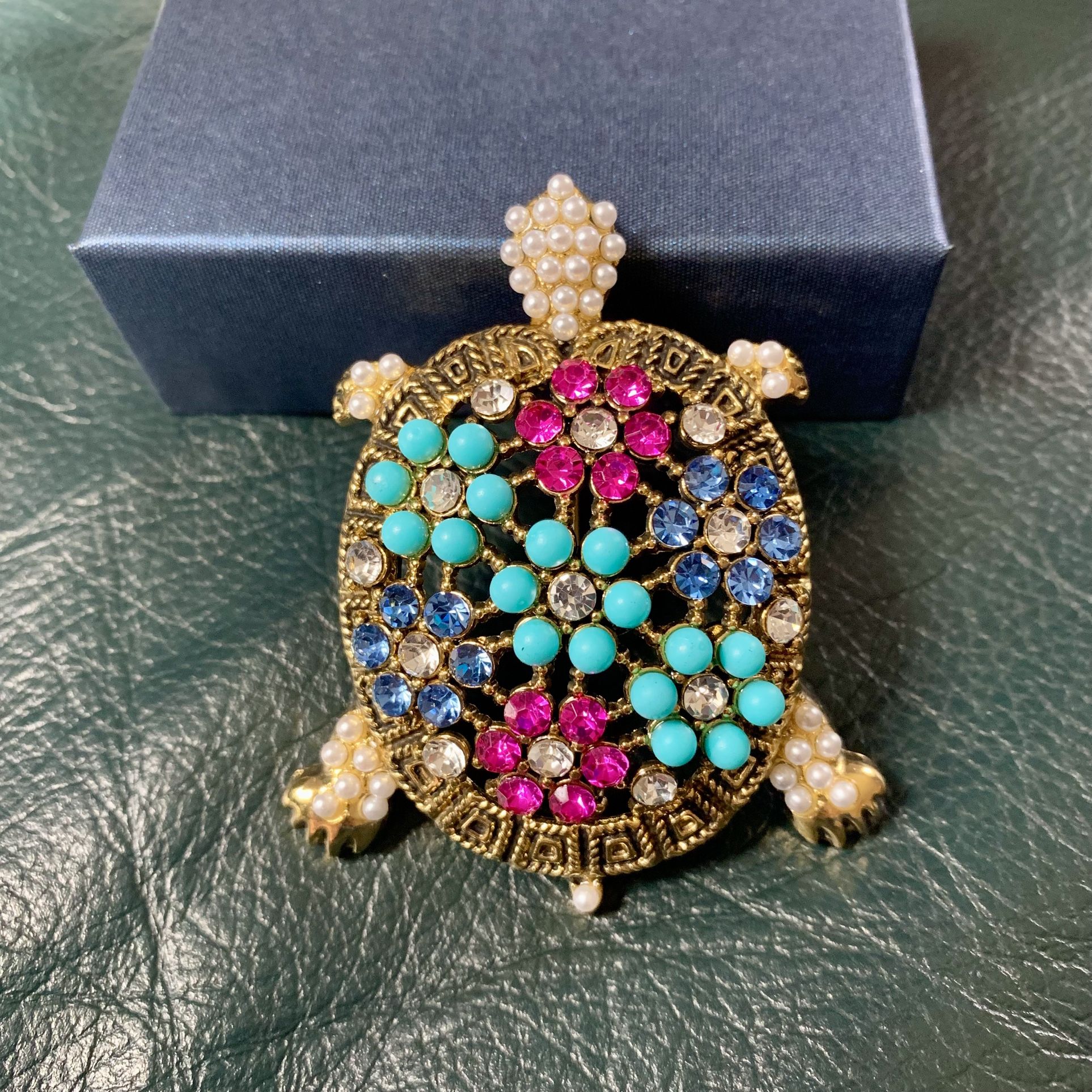 Vintage style turtle-shaped brooch with a gold-tone metal base, adorned with faux pearls, turquoise beads, and rhinestones in pink, blue, and clear colors. Decorative and colorful, perfect as a statement accessory or collectible piece. Size 3”x 2.25”