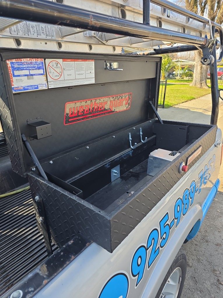 This toolbox has been mounted on my work truck for about 2 years. Perfect working condition. No dents, dings or scrapes. I have all the keys and the lock works great. Lubed every month. Struts are in perfect condition. Made before WEATHERGUARD was bought out and quality decreased. Mounting holes already drilled. Comes with hardware.
