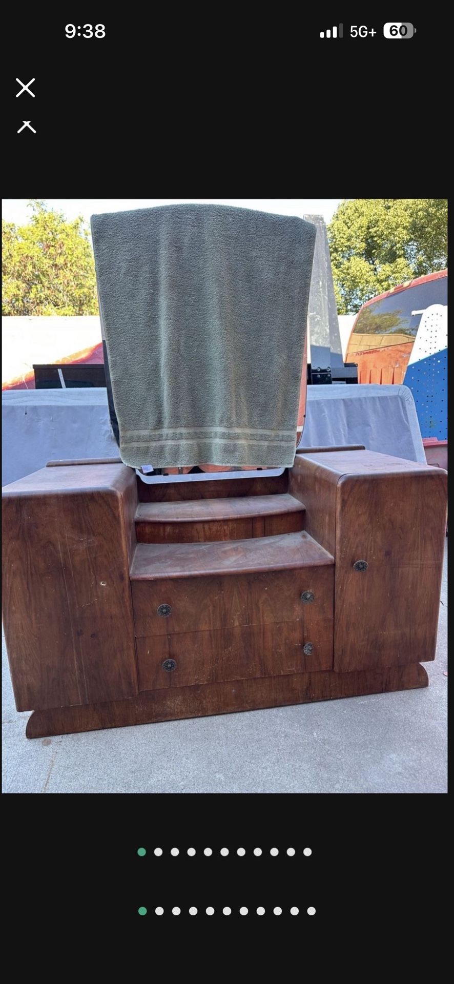 Vintage kids size small dresser with mirror All drawers open and close Needs a good dusting cleaning and maybe even painting to bring it back to life All drawers have knobs except for one Look at pictures, please Sold as is