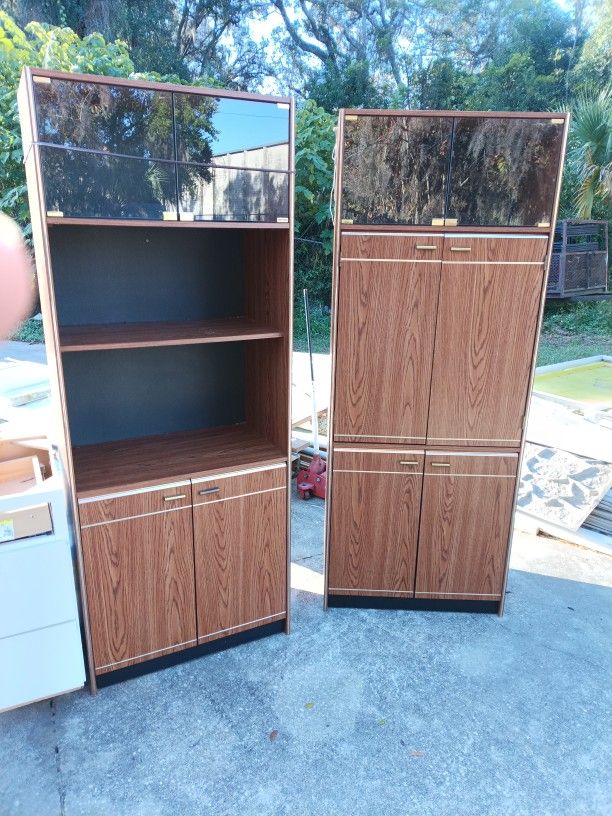 Two Wood Cabinets With Shelves N Glass Doors.Also They Have Lights That Plug In