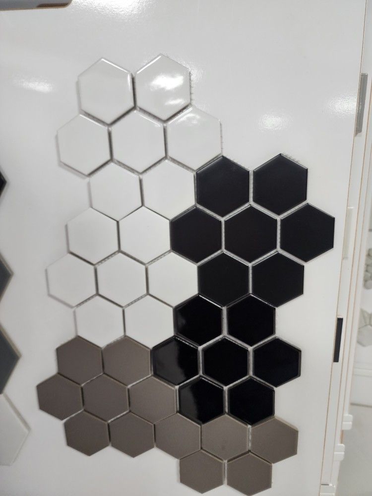 BLACK AND WHITE Porcelain Tile Hexagon Matte Finish 2x2. Pool rated, perfect for shower, bathroom, kitchen. Brand New. Each sheet is one sq ft. 132 sheets. Floor and Decor sells these at $2.89 per sheet. My price per sheet is $2.27