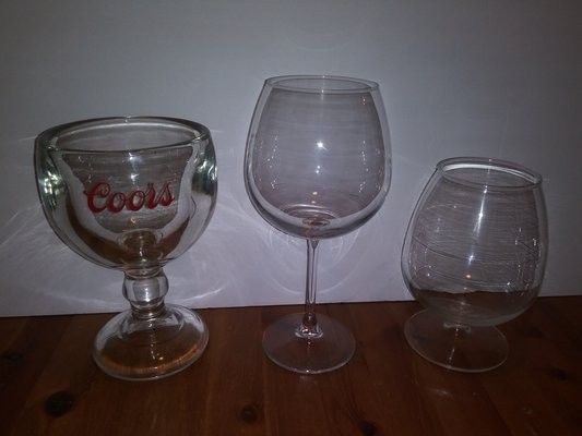 $5.00 each *XPOSTED*FCFS*FIRM*USED* Can be used f or Valentine's Day & be filled with candy * Vintage Large COORS Heavy Stemmed Glass Beer Goblet/Mug - before serving beer in these, they would frost them - about 7 1/2" tall, 4 1/4" opening - heavy duty * Large wine glass - about 8 3/4" tall, 3" opening * Large wine brandy/cognac snifter - about 6 1/4" tall, 3" opening