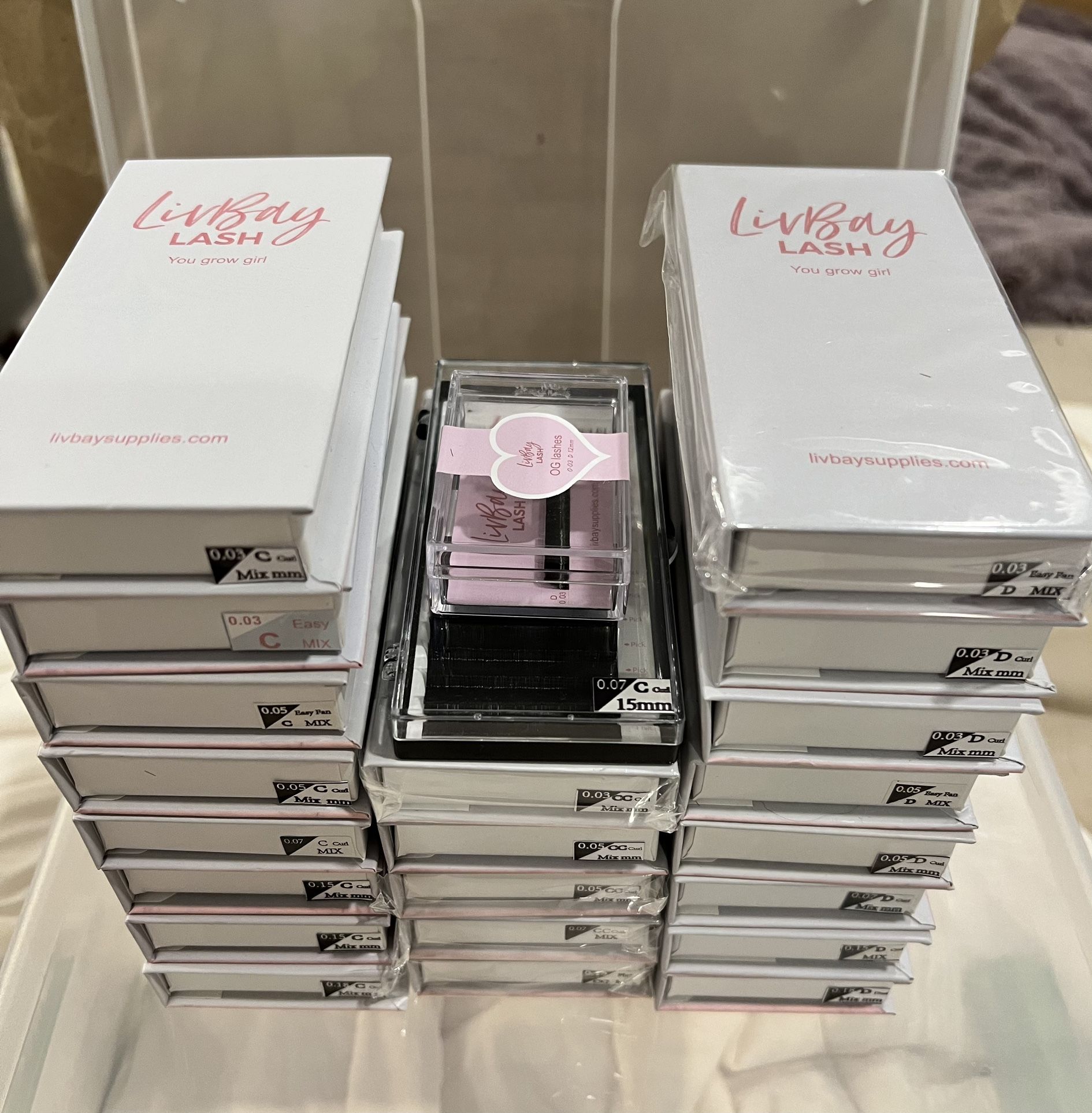 All brand new, unused. All overstock and no longer needed. Selling as a bundle. -22 packs of LivBay Lash Extensions -BONUS: Misc lash extension supplies: 4 different premium Bella Lash tweezers, 1 Borboleta Fine Angle tweezer, micropore tape, 2 fan storage pans, lint-free applicator wands, lash lift applicator brushes, practice lashes & several other items