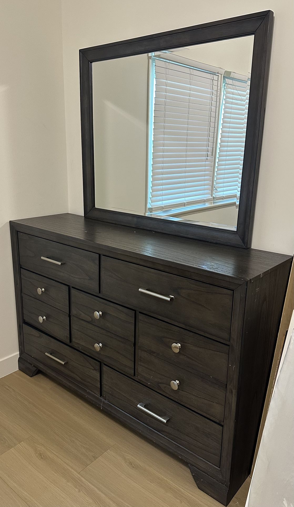 Selling a solid dark wood dresser with matching mirror in great condition. Clean, sturdy, and all drawers slide smoothly. No major damage, ready to use right away. Tons of storage with multiple drawers—perfect for bedroom organization.