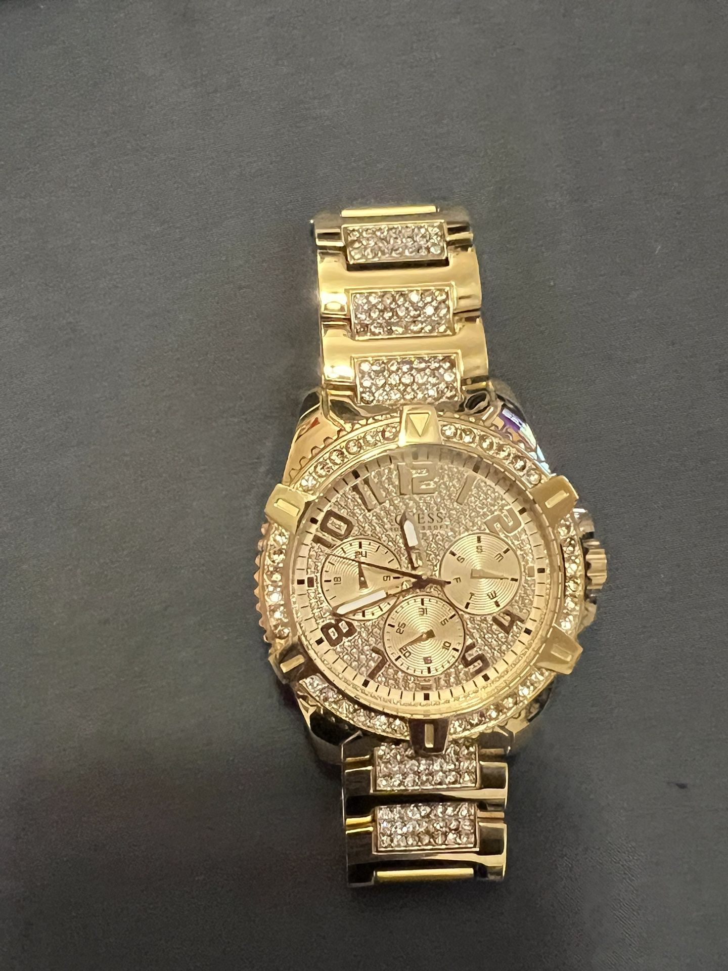 GUESS Gold-Tone Rhinestone Multifunction Watch Used, needs new battery. Working, comes with og box