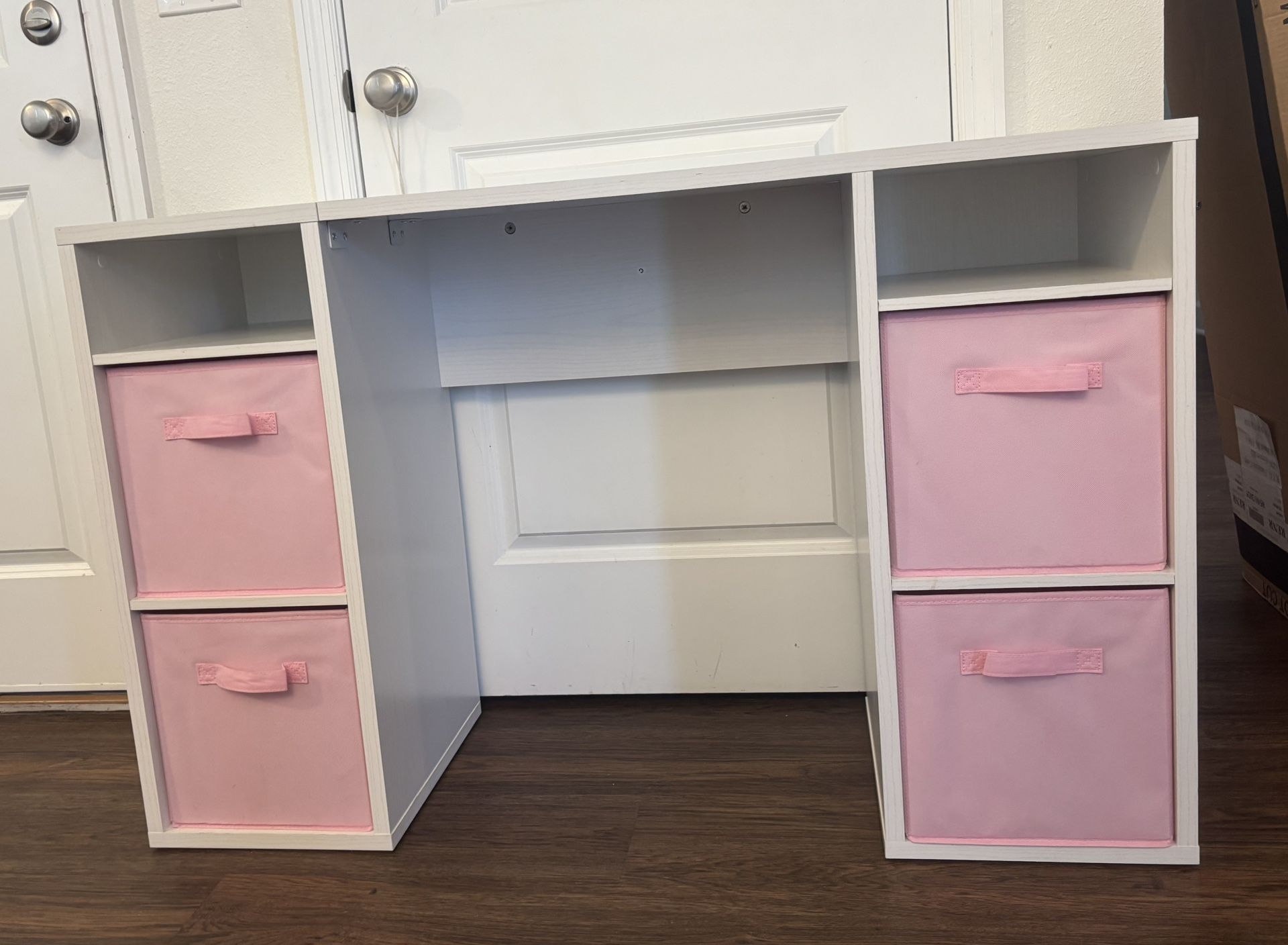 White desk - light pink storage bins slight scratches under the stuck on hooks (see photo 4)