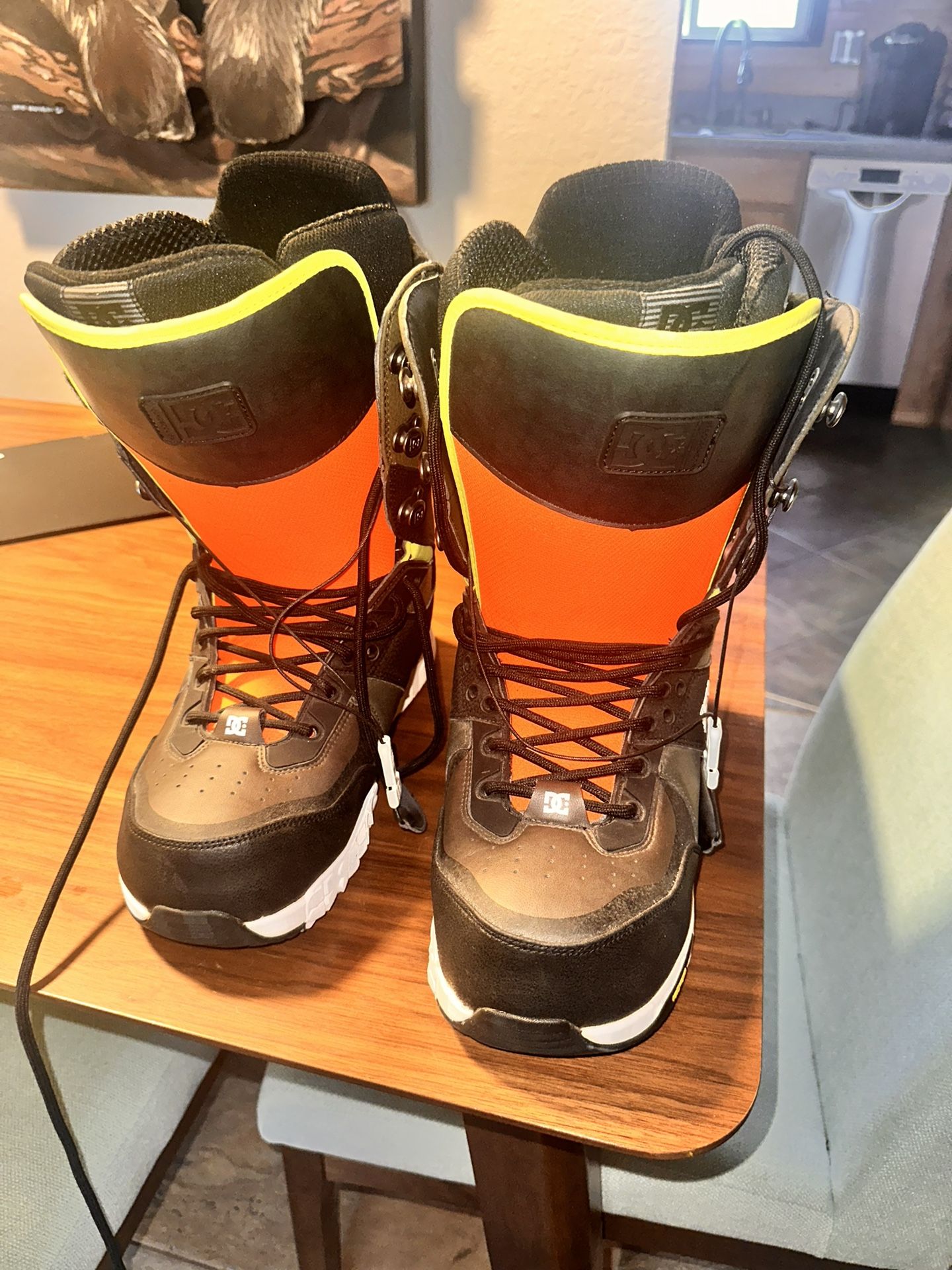 Size 12 DC lace up snowboard boots. Perfect for the lace up boot lovers out there. Purchased these thinking they would fit like my normal shoes size, but had to size down. They’ve only been tried on, but never used or strapped into a snowboard. $80