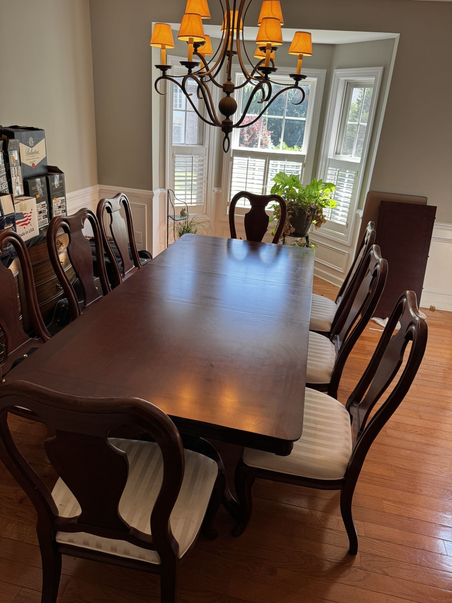 Dining Table plus 8 chairs. 72”x44” plus two 20” leaves