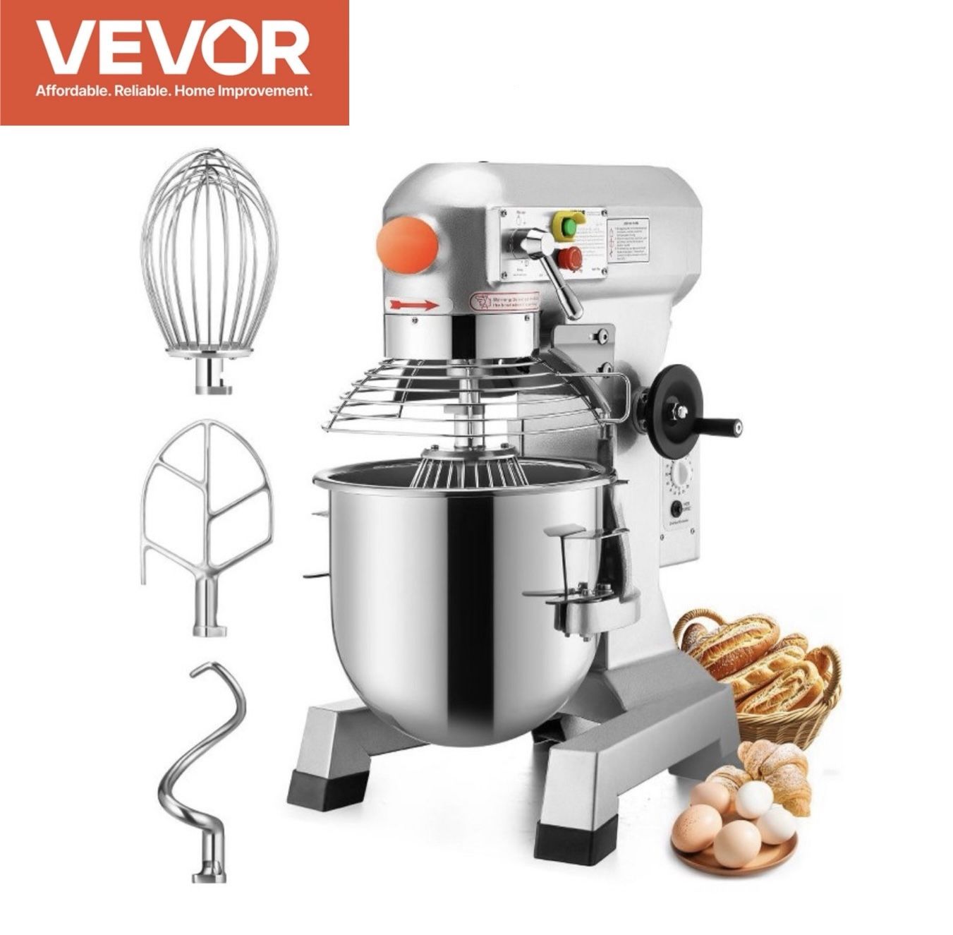 Brand new VEVOR 15 Qt Heavy Duty Commercial Food Mixer: This stand mixer has a 15Qt bowl for mixing a large number of food at one time; The food-grade stainless steel mixing parts are sturdy and durable to use; It adopts a powerful motor with 3 adjustable speeds; Three mixing stirrers are equipped for versatile use; Besides, it’s easy to operate with detachable parts, the adjustable bowl height and a security guard; This food mixer is ideal for cooking enthusiasts. Features: • The 15 Qt large bowl is made of food-grade stainless steel, which can mix maximum 3.3 lbs dough at one time • The 600-watt high-performance motor ensures stable operation, providing three adjustable mixing speeds • It has three replaceable attachments, including a spiral dough hook, a flat beater, and a wire whip • Premium Quality & Large Capacity: This industrial mixer is up to hygienic standards; All parts that touched with foods adopt food-grade 304 stainless steel; The 15Qt capacity bowl is large enough to mix for 3.3 lbs dough in one-go, meeting your various commercial needs; • Replaceable Attachments: Three replaceable attachments are included ; -Spiral Dough Hook: Used for smoother mixer operation; Ideal for pizza and other heavy dough; It is commonly used in first and second speed; -Flat Beater: Used for mashing potatoes or vegetables, mixing cakes, batters, or icing; It is commonly used in first and second speed; -Wire Whip: Used for aerating light mixes such as whipped cream, egg white, and mixing light icings; It is commonly used in second and third speed; • Three Speeds Adjustable: The stand mixer provides three different speeds of control (130 RPM/233 RPM/415 RPM); The powerful 600-watt motor with gear-driven transmission for durability and reliability meets different mixing requirements; • Protective Design: A stainless steel wire bowl guard is designed to keep large items from falling into the bowl during operation; The height of the bowl can be easily adjusted by a turning wheel; The START and STOP buttons operate independently, ensuring security; • Wide Application: This multifunctional commercial food mixer is perfect for mixing dough, pastry, mashed vegetables, mayonnaise, and so on; Widely used in bakeries, restaurants, pizzerias, commercial kitchen, and canteens; • Specification: -Power: 600 W; -Bowl Volume: 15Qt; -Mixing Speed: 130 r/min, 233 r/min, 415 r/min; -Max; Kneading Capacity: 3.3 lbs / 1.5 kg; -Product Dimensions: 14.6 x 18.7 x 26.6 inch / 37.2 x 47.4 x 67.6 cm; -Product Weight: 110 lbs / 49 kg • [Package Content] 1 x Commercial Mixer; 1 x Dough Hook; 1 x Flat Beater; 1 x Wire Whip • Model #: DDJBJ15LCLSB15B01V1