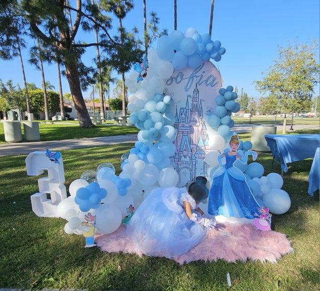 New in just once time include cinderella cardboard/4 little cardboard mouses/4 birds / cardboard number 3 / background castle / All for $75 Also i have the Rectangular tablecloths for $3 each blue color