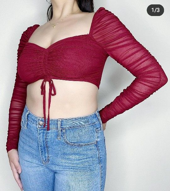 Burgundy crop top with sheer sleeves Small Medium Large available No see through Pick up only Marie's Glam Doll Boutique on Instagram