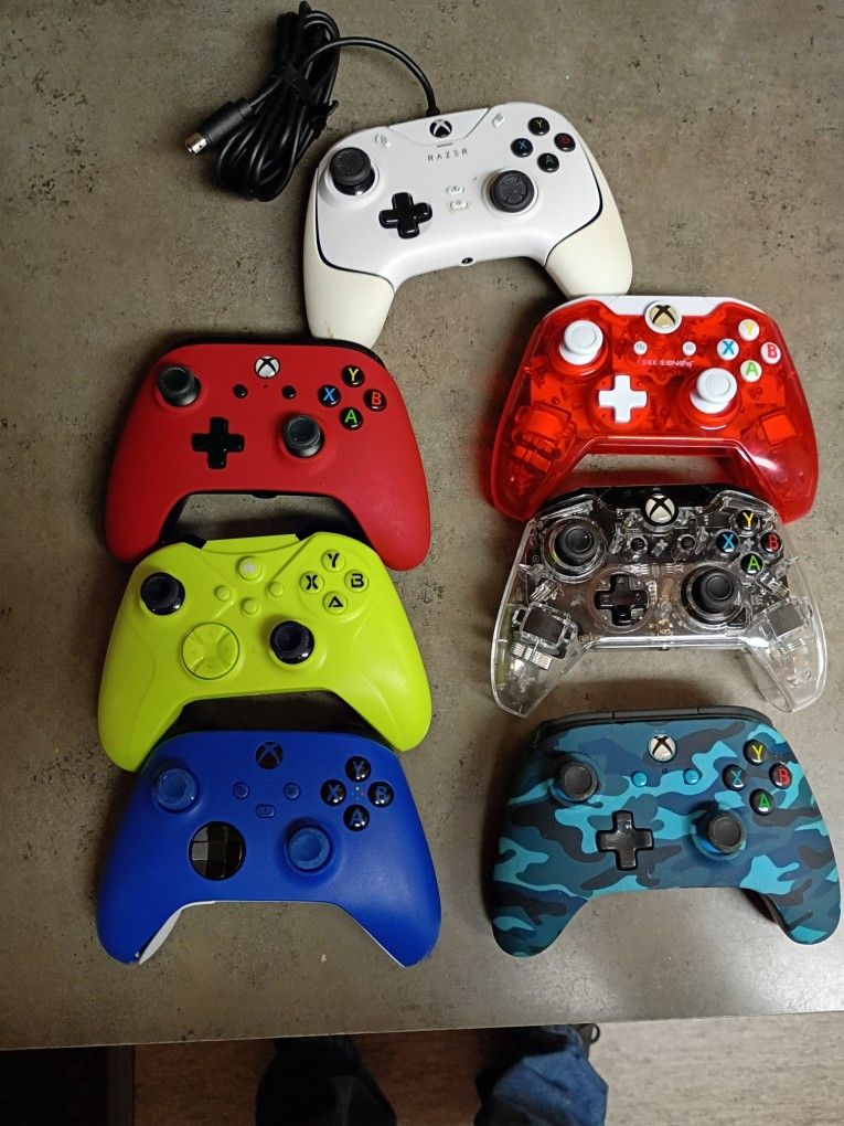 Lot of 7 Xbox controllers for parts or repair 6 wireless & 1 wired (3 PDP, 1 powerA, 1 Xbox Series X/S OEM, 1 Unbranded & 1 Razer Wolverine. Issues include no power, stuck buttons, cracks in plastic, stick drift and 1 that gets an error code from the Xbox. The Xbox series controller works but the handle is coming apart and there is a crack in the plastic, wolverine controller works but has stick drift and the right trigger does not depress all the way plus it needs a usb breakaway cable, "Pick Up In Milwaukie"