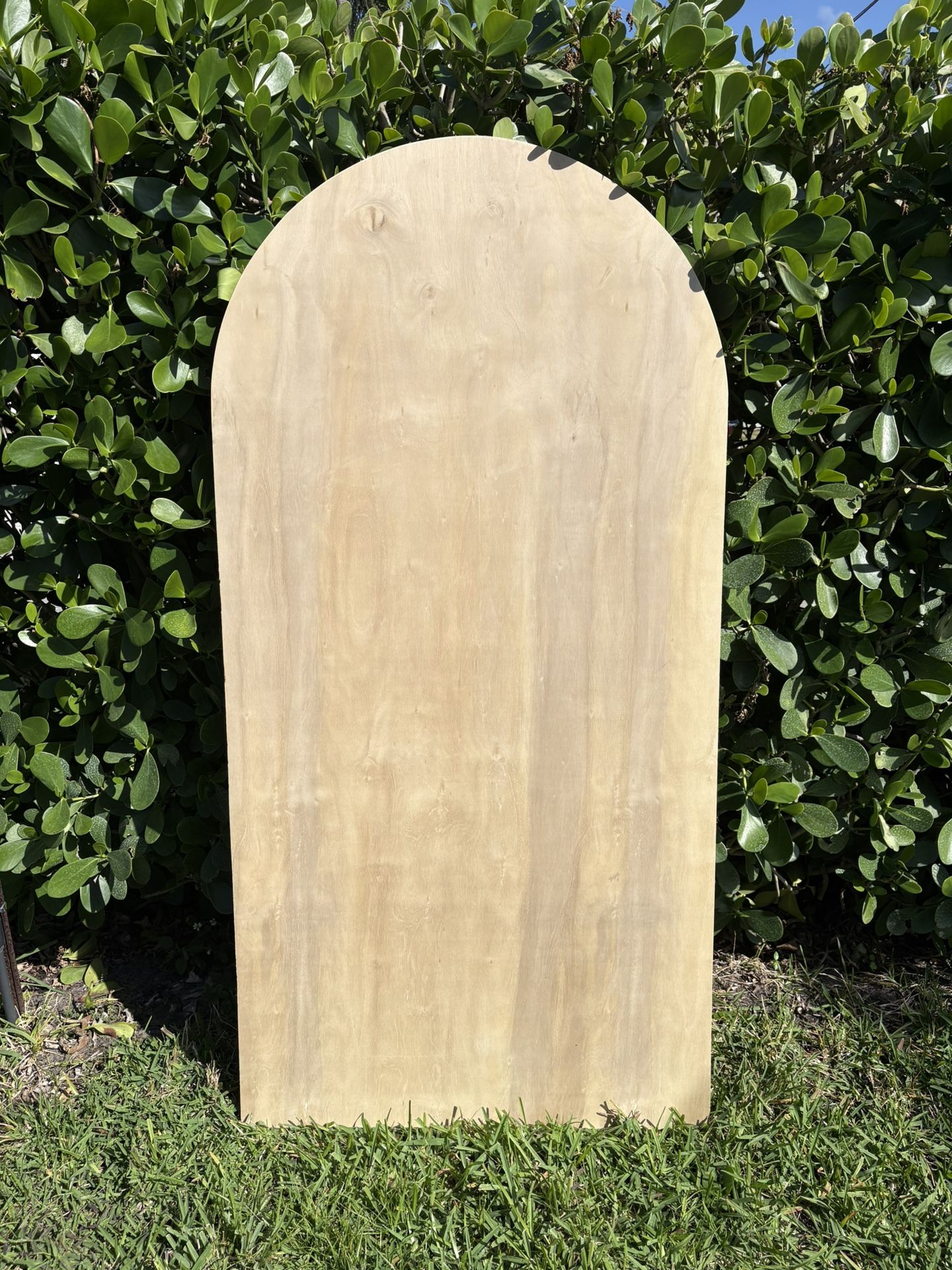 Arched backdrop, unfinished wood Height is 6’, width is 3’ Not pictured: stand on backside to hold it upright
