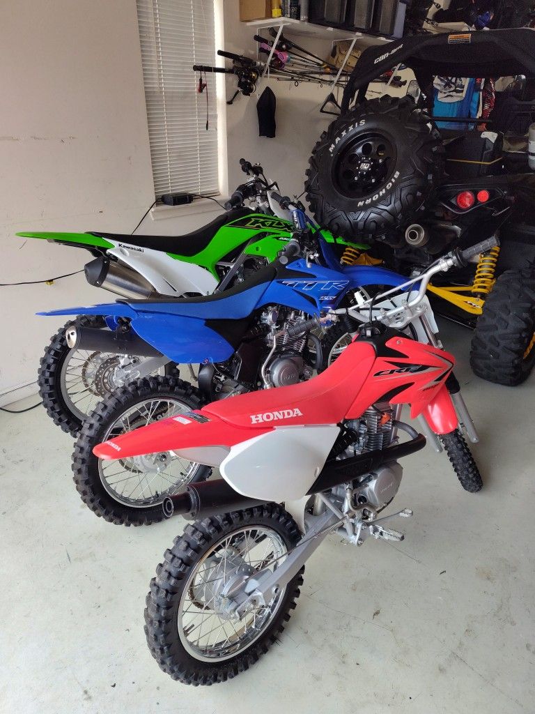READ AD COMPLETELY. Selling 3 dirt bikes, 2021 Kawasaki KLX 230r for $3950, 2022 Yamaha TTR 125 for $3500, and 2009 Honda CRF 80 for $1700. All come with a helmet, 2 keys, owners manual, and bill of sale.