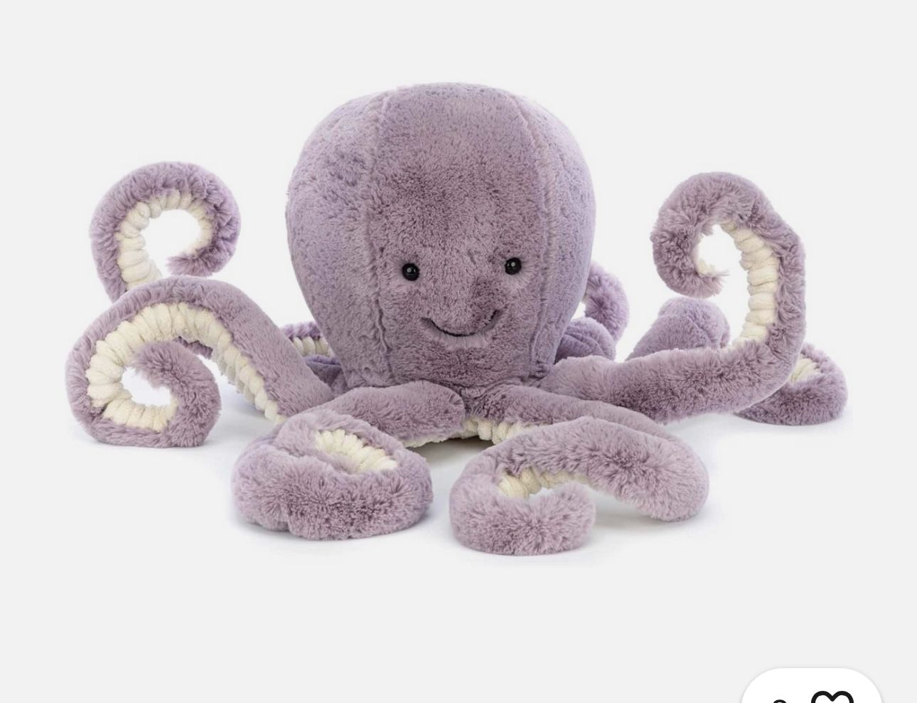 The Jellycat Purple Octopus Maya and Little Maya (two separate toys - one big, one little) are adorable stuffed animals from the renowned brand Jellycat. Out of stock Collectors items Little Maya Octopus measures 10.6 x 3.9 x 3.9 inches. Sitting height is 5.1 inches. Big Maya Octopus measures 33.9 x 11.8 x 11.8 inches. Sitting height is 13.8 inches. New, excellent condition. Will only sell together. Shipping extra. Tags have been removed, but items are in perfect condition. Toys Christmas Vintage Kids Children Gift Present Surprise Mommy Mom Baby Ocean Sea Animals Lavender Last minute Used New Shower gift Baby