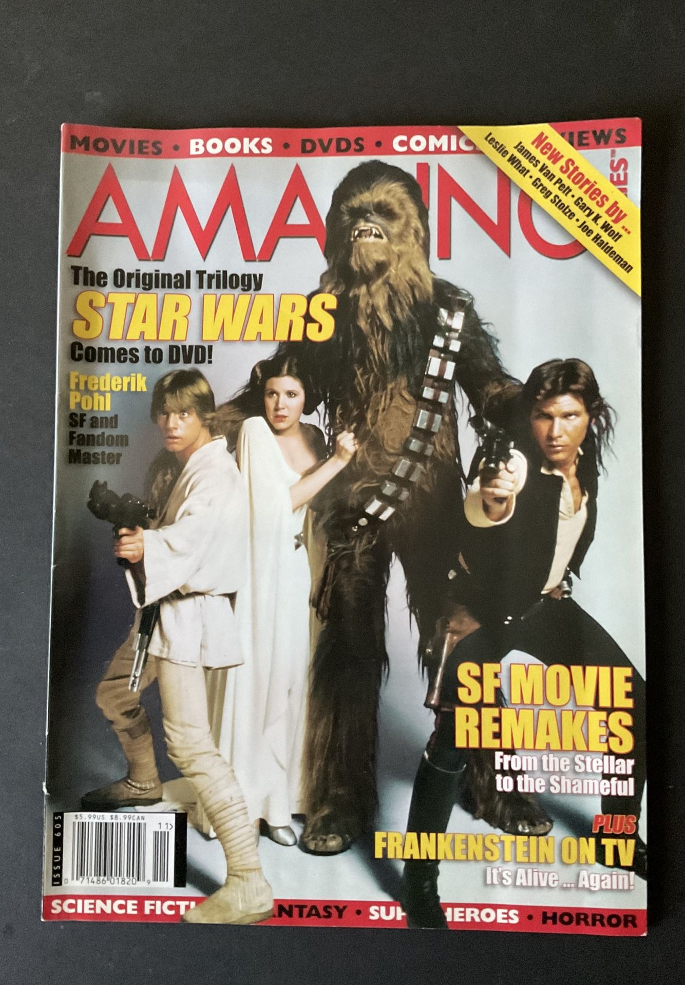 Amazing Stories Issue #605 (November 2004) is a science fiction magazine, published by Paizo, featuring a cover story on the Star Wars Trilogy DVD release. It provides unique content and articles related to the original Star Wars franchise, distinct from the films themselves. It is sometimes associated with other, different, collectibles on secondary markets.