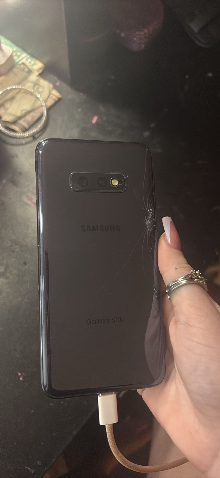 galaxy s10e works perfectly has been completely wiped & reset a couple cracks on the back, besides that, in perfect condition